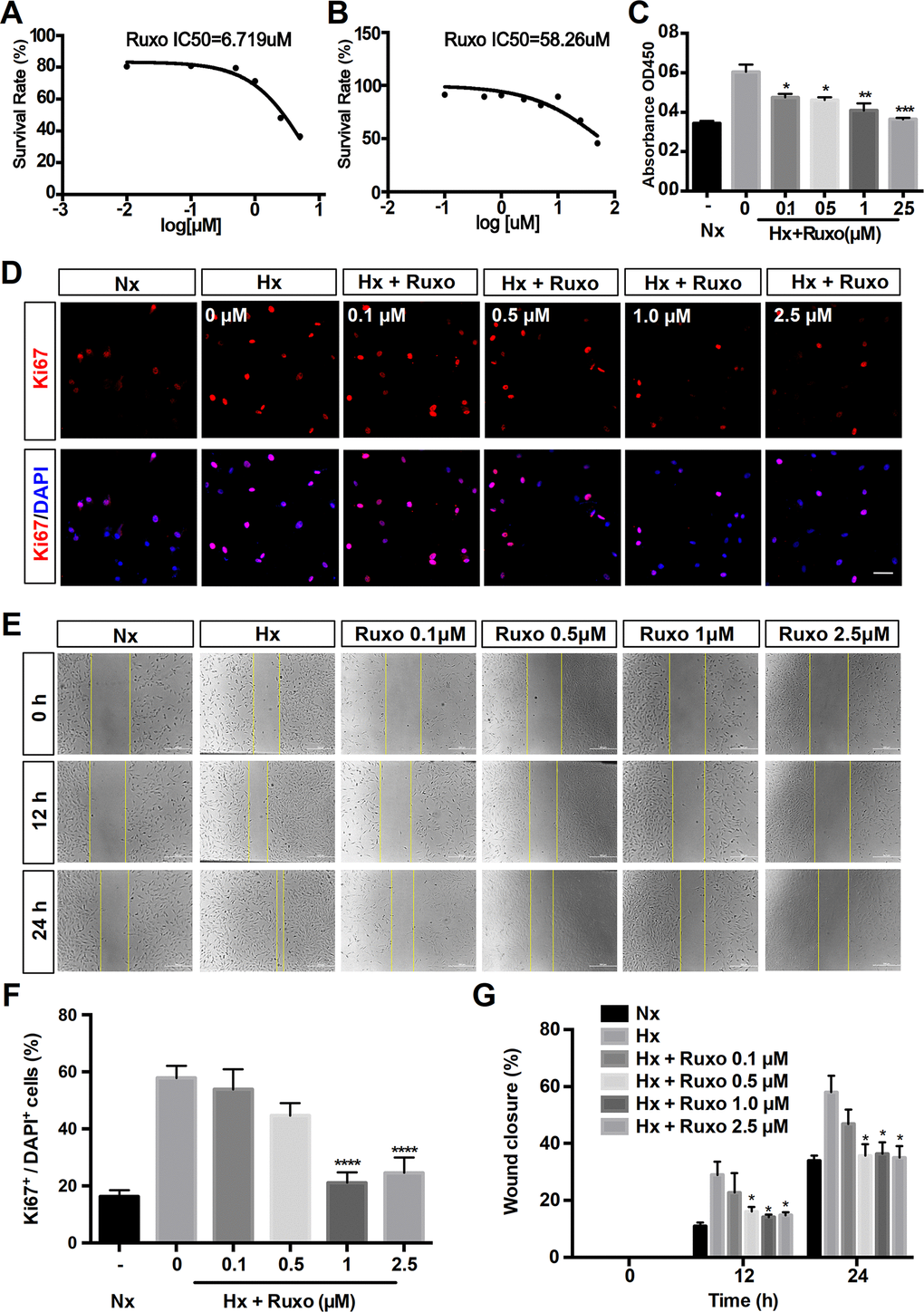 To further explore the effects of ruxolitinib in PAH, we investigated the regulation of rPASMCs migration and proliferation by ruxolitinib. Firstly, the cytotoxicity of ruxolitinib was assessed by 3-[4,5-Dimethylthiazol-2-yl]-2,5-diphenyltetrazolium Bromide (MTT) assay and evaluated by the 50% inhibitory concentration (IC50) values (6.719 μM under hypoxic and 58.26 μM under normoxic) (Figures 7A, 7B). Therefore, the concentrations of ruxolitinib was used including 0, 0.1, 0.5, 1 and 2.5 μM. The result of CCK-8 assay indicated the inhibited proliferation in PASMCs with the treatment of ruxolitinib (Figure 7C). With concentration increasing, the inhibition effect became more obvious. Coincidentally, immunofluorescence assay demonstrated that administration of ruxolitinib significantly decreased the expression of Ki67 (a marker of proliferation) in hypoxia-induced rPASMCs (Figures 7D, 7F). Moreover, scratch wound assay showed that rate of closure was increased under hypoxia exposure for 12h and 24h, nevertheless hypoxia-induced migration was significantly suppressed by ruxolitinib (Figures 7E, 7G). Collectively, these data strongly suggest that ruxolitinib could effectively inhibit cell proliferation and cell migration under hypoxia exposure in vitro.