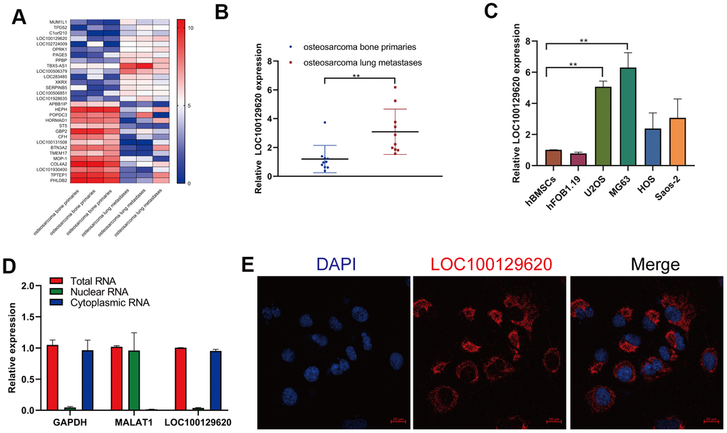In order to detect the role of gene expression in the metastasis of osteosarcoma, we first analyzed the expression data from human osteosarcoma bone primary tissues and lung metastases in GEO (dataset: GSE85537). Heatmap analysis shows that the gene expression profile in orthotopic osteosarcoma primary tissue and osteosarcoma lung metastasis tissue was significantly different (Figure 1A). The expression of TPD52, C1orf210, LOC100129620, and LOC102724009 was significantly higher in extracted lung metastasis tissue than in in situ osteosarcoma tissue (Figure 1B and Supplementary Figure 1A), while the expression of APBB1IP, HORMAD1, ST5, and LOC101930400 was significantly lower in lung metastasis tissue than in orthotopic osteosarcoma tissue (Supplementary Figure 1B). Then we detected the expression of LOC101930400 in hBMSCs, hFOB1.19 cells, and osteosarcoma cell lines. The expression of LOC101930400 in U2OS, MG63, HOS, and Saos-2 cells was higher than that in hBMSCs and hFOB1.19 cells (Figure 1C). The location of LOC101930400 in cells is important to its function in osteosarcoma cells. The qRT-PCR results show that LOC101930400 was mostly located in the cytoplasm, using GAPDH and lncRNA MALAT1 as controls (Figure 1D). Immunofluorescence in situ hybridization showed that LOC101930400 was localized in the cytoplasm; its nuclear levels were very low (Figure 1E).