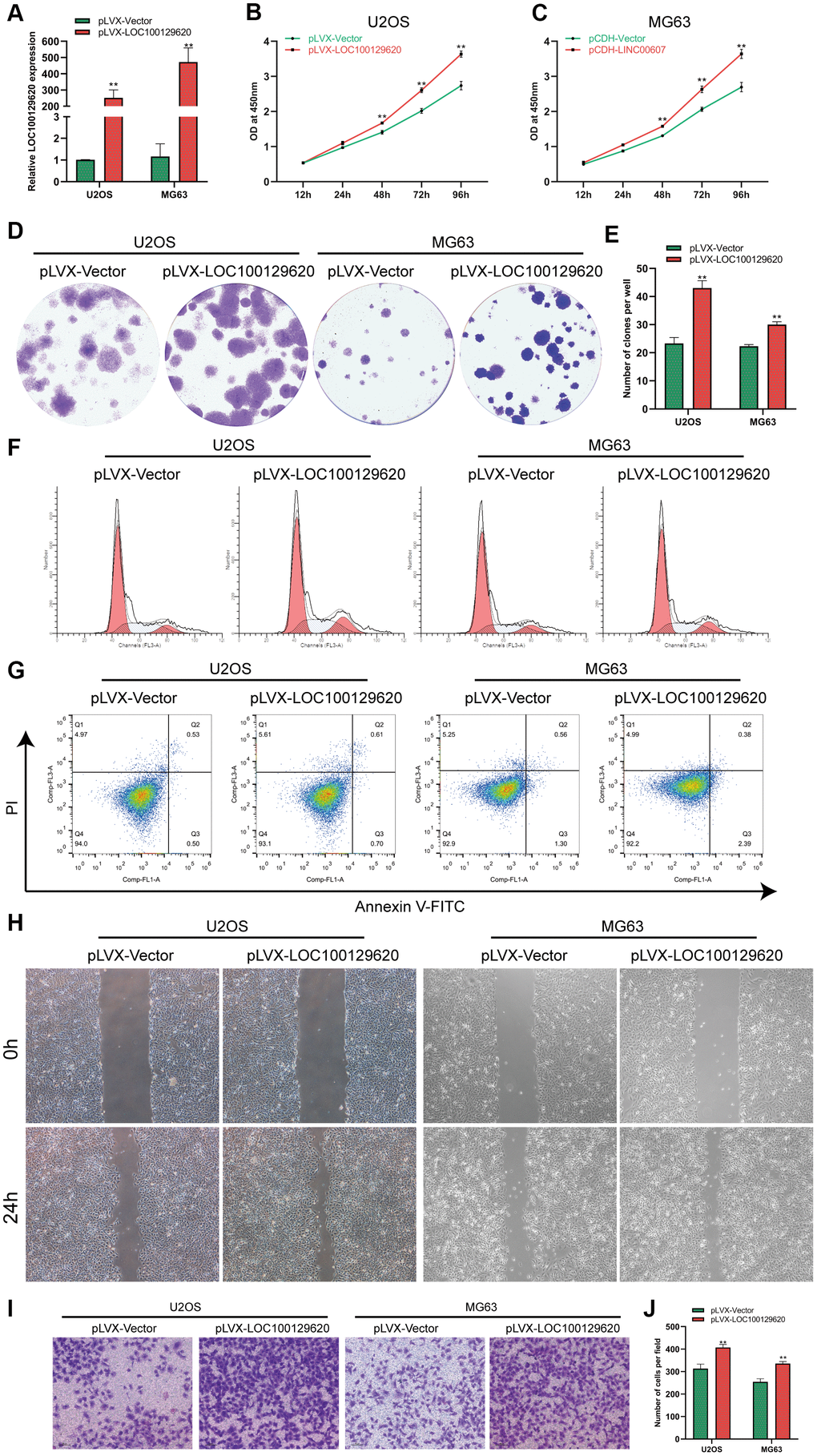 The expression of LOC100129620 in U2OS and MG63 cells in the pLVX-LOC100129620 group was significantly higher than that in the pLVX-Vector group (Figure 2A). CCK-8 results show that overexpression of LOC100129620 could promote the proliferation of U2OS and MG63 cells (Figure 2B, 2C). The colony formation assay indicated that LOC100129620 overexpression could increase the proliferation of U2OS and MG63 cells (Figure 2D, 2E). Flow cytometry was used to detect the influence of LOC100129620 on the cell cycle of osteosarcoma cells. The results show that overexpression of LOC100129620 could increase the proportion of U2OS and MG63 cells in the S phase and the G2/M phase and reduce the proportion of cells in the G1 phase (Figure 2F and Supplementary Figure 2A). However, overexpression of LOC100129620 had no effect on the apoptosis of U2OS and MG63 cells (Figure 2G). The cell scratch assay showed that overexpression of LOC100129620 could promote the migration of U2OS and MG63 cells (Figure 2H). The Transwell assay results show that overexpression of LOC100129620 could promote the invasion of U2OS and MG63 cells (Figure 2I, 2J).