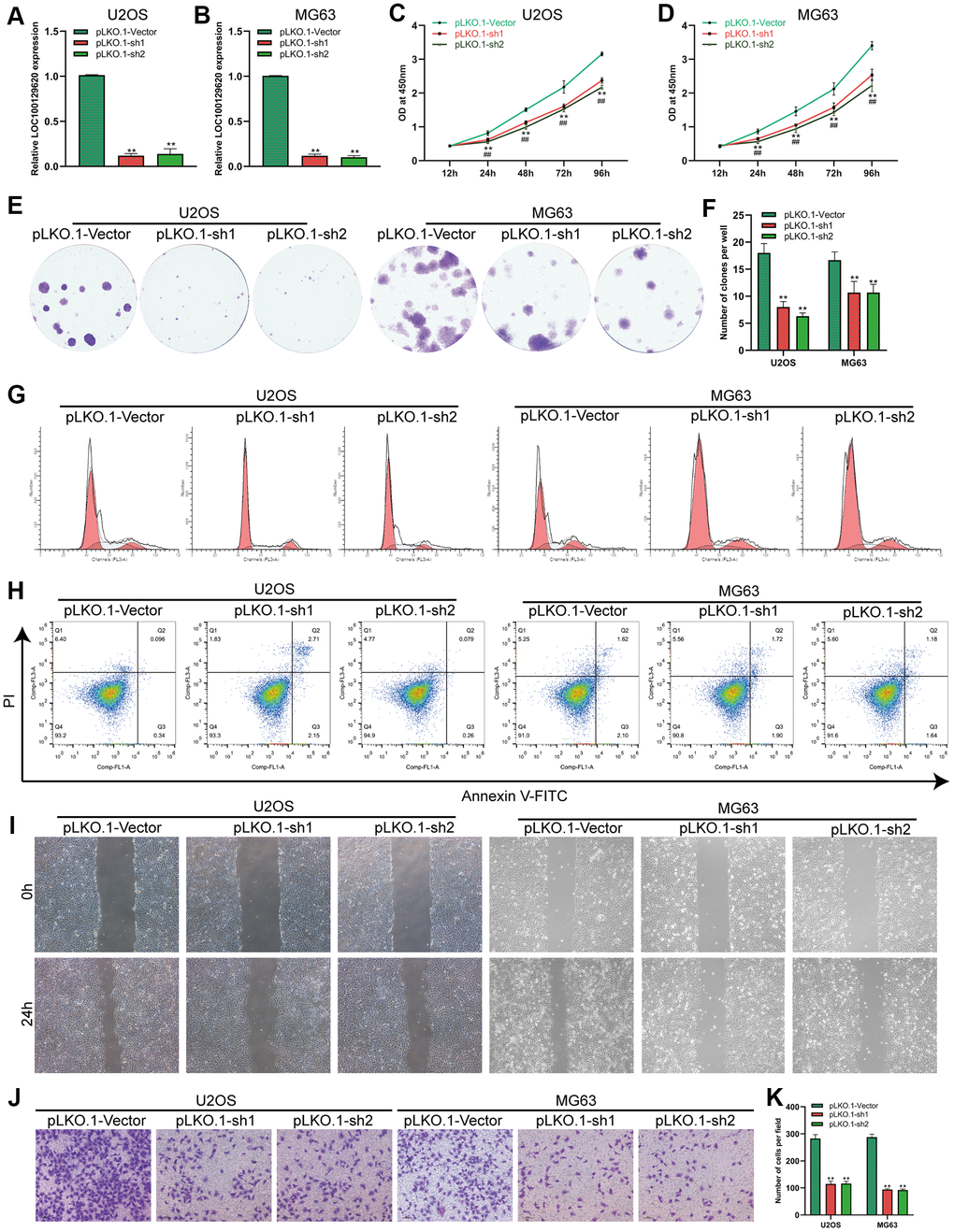 The expression of LOC100129620 in U2OS and MG63 cells in the pLKO.1-sh1 and pLKO.1-sh2 groups was significantly lower than that in the pLKO.1-Vector group (Figure 3A, 3B). CCK-8 assay results show that suppression of LOC100129620 expression inhibited the proliferation of U2OS and MG63 cells (Figure 3C, 3D). The colony formation assay results indicate that suppression of LOC100129620 expression inhibited the proliferation of U2OS and MG63 cells (Figure 2E, 2F). Flow cytometry was used to detect the influence of LOC100129620 on the cell cycle of osteosarcoma cells. The results show that suppression of LOC100129620 expression could decrease the proportion of U2OS and MG63 cells in the S phase and the G2/M phase and increase the proportion of cells in the G1 phase (Figure 2G and Supplementary Figure 2B). However, suppression of LOC100129620 expression had no effect on the apoptosis of U2OS and MG63 cells (Figure 2H). The cell scratch assay showed that suppression of LOC100129620 expression inhibited the migration of U2OS and MG63 cells (Figure 2I). The Transwell assay results show that suppression of LOC100129620 expression inhibited the invasion of U2OS and MG63 cells (Figure 2J, 2K).