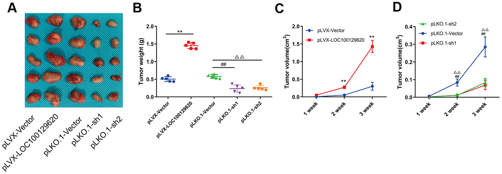 In order to detect the effect of LOC100129620 on osteosarcoma cells in vivo, LOC100129620 was overexpressed or knocked down in U2OS cells, which were subsequently implanted subcutaneously in nude mice. The tumor volume was measured at 1, 2, and 3 weeks after implantation. After 3 weeks, the mice were sacrificed, and the tumors were weighed. Overexpression of LOC100129620 in U2OS cells promoted tumor growth, while LOC100129620 knockdown in U2OS cells inhibited tumor growth (Figure 4A). Tumor weight in the pLVX-LncRNA LOC100129620 group was higher than that in the pLVX-Vector group, and tumor weight in the pLKO.1-sh1 and pLKO.1-sh2 groups was lower than that in the pLKO.1-Vector group (Figure 4B). The progression of osteosarcoma cells in the pLVX-LOC100129620 group was increased compared with the pLVX-Vector group (Figure 4C). However, the progression of osteosarcoma cells in the pLKO.1-sh1 and pLKO.1-sh2 groups was decreased compared with the pLKO.1-Vector group (Figure 4D).