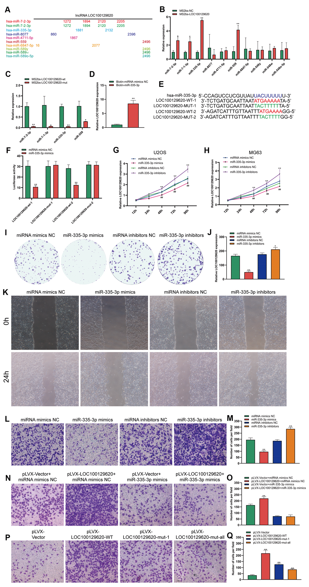 LOC100129620 is mainly located in the cytoplasm. LncRNA also affects the expression of its target genes by controlling the expression of miRNA. In some tumor cells and specific tissues, some lncRNAs carry the “seed sequence” of certain miRNAs, which bind miRNAs like sponges, thereby preventing miRNAs from binding to their target mRNAs. We used miRDB software to list the top 10 miRNAs that have binding sites to LOC100129620, and marked the location of the binding sites (Figure 5A). Subsequently, the MS2bs RIP method was used to detect the binding of LOC100129620 to miRNA. LOC100129620 can bind to miR-7-2-3p, miR-7-1-3p, miR-335-3p, and miR-559 (Figure 5B). Among these, miR-335-3p has the strongest binding affinity with LOC100129620. After we mutated the binding site of LOC100129620 with miRNA, the binding affinity was significantly reduced (Figure 5C). We also used a Biotin-miRNA pull-down assay to detect the binding of miR-335-3p and LOC100129620. The results show that miR-335-3p can bind to LOC100129620 (Figure 5D). There are two predicted binding sites for miR-335-3p in LOC100129620. Based on the predicted binding sites, we constructed binding site mutant and wild-type dual-luciferase reporter genes (Figure 5E). The detection of luciferase activity revealed that miR-335-3p can inhibit the expression of the wild-type luciferase reporter gene without affecting the activity of mutant luciferase (Figure 5F). No studies have reported the effect of miR-335-3p on the function of osteosarcoma cells. The CCK-8 assay revealed that overexpression of miR-335-3p could reduce the viability of U2OS and MG63 cells, while inhibition of miR-335-3p expression can promote the viability of U2OS and MG63 cells (Figure 5G, 5H). The results of the colony formation assay show that overexpression of miR-335-3p could effectively inhibit the proliferation of U2OS cells, while inhibition of miR-335-3p can effectively promote the proliferation of U2OS cells (Figure 5I, 5J). The results of the wound healing assay show that overexpression of miR-335-3p could effectively inhibit the migration of U2OS cells, while knockdown of miR-335-3p could effectively promote the migration of U2OS cells (Figure 5K). The results of the Transwell assay show that overexpression of miR-335-3p could effectively inhibit the invasion of U2OS cells, while inhibition of miR-335-3p could effectively promote the invasion of U2OS cells (Figure 5L, 5M). LOC100129620 could promote the invasion of U2OS cells; however, the stimulatory effects on the invasion of U2OS cells were reduced when U2OS cells overexpressed miR-335-3p (Figure 5N, 5O). However, when we mutated the binding site of LOC100129620 for miR-335-3p, the stimulatory effect of LOC100129620 on U2OS cell invasion was lost (Figure 5P, 5Q).