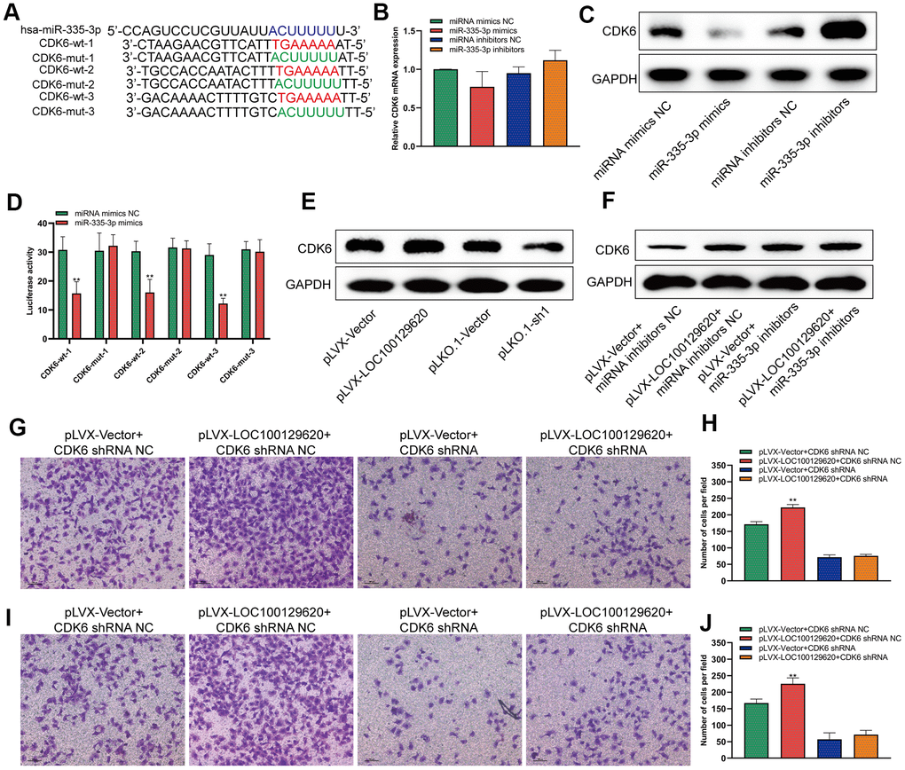 MiRNA regulates the translation of mRNA by binding to the 3′-UTR region of mRNA. It was predicted by miRDB software that miR-335-3p could bind to the 3′-UTR region of CDK6 with three different binding sites. We constructed different binding site mutation sequences (Figure 6A). Using miR-335-3p mimics and miR-335-3p inhibitors to regulate the expression of miR-335-3p in U2OS cells, overexpression or knockdown of miR-335-3p had no effect on the mRNA levels of CDK6 in U2OS cells (Figure 6B). Overexpression of miR-335-3p could inhibit the protein expression of CDK6, while knockdown of miR-335-3p could promote the protein expression of CDK6 (Figure 6C). The results of the luciferase reporter gene assay show that overexpression of miR-335-3p can inhibit the activity of the wild-type luciferase reporter gene, but has no significant effect on the activity of the mutant luciferase reporter gene (Figure 6D). Overexpression of LOC100129620 could promote the protein expression of CDK6, while inhibiting the expression of LOC100129620 could reduce the protein expression of CDK6 (Figure 6E). In osteosarcoma tissue, the expression of LOC100129620 was negatively correlated with the expression of miR-335-3p (Supplementary Figure 3A), while the expression of LOC100129620 was positively correlated with the expression of CDK6 (Supplementary Figure 3B). However, when miR-335-3p inhibitors were used to inhibit the function of miR-335-3p in U2OS cells, the stimulatory effect of LOC100129620 on CDK6 protein expression was decreased (Figure 6F). Upon CDK6 knockdown in U2OS cells, the stimulatory effects of LOC100129620 on the invasion of U2OS cells were reduced (Figure 6G, 6H). The same result was obtained in MG63 cells (Figure 6I, 6J).