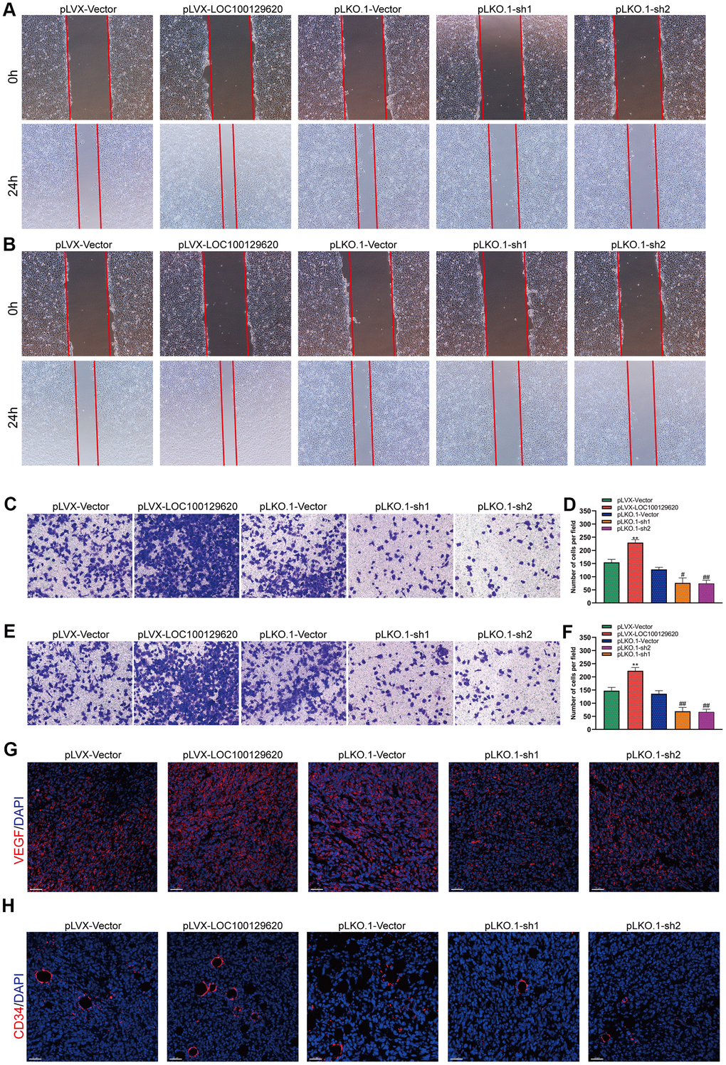 The formation of blood vessels inside tumors plays an important role in tumor growth. Tumor blood vessels provide tumor tissue with oxygen and nutrients necessary for its metabolism, so that tumors could grow rapidly, and at the same time provide a transport pathway for tumor metastasis. Tumor cells could promote angiogenesis by secreting a variety of cytokines. Using the culture supernatant of osteosarcoma cells to culture HUVEC cells, the effect of tumor cells on HUVECs could be observed. The results of the cell scratch experiments show that overexpression of LOC100129620 increased the stimulatory effect of osteosarcoma cells on the migration of endothelial cells, while LOC100129620 knockdown could reduce the stimulatory effects of osteosarcoma cells on the migration of endothelial cells (Figure 7A). The Transwell assay results show that overexpression of LOC100129620 increased the stimulatory effects of U2OS cells on the invasion of endothelial cells, while LOC100129620 knockdown reduced the stimulatory effects of U2OS cells on the invasion of endothelial cells (Figure 7B, 7C). The same results were obtained in MG63 cells (Figure 7E, 7F). Immunofluorescence analysis showed that overexpression of LOC100129620 promoted the expression of VEGF, while knockdown of LOC100129620 inhibited the expression of VEGF within the xenograft model (Figure 7G). Similarly, overexpression of LOC100129620 increased the number of endothelial cells, while knockdown of LOC100129620 reduced the number of endothelial cells within the xenograft model (Figure 7H).
