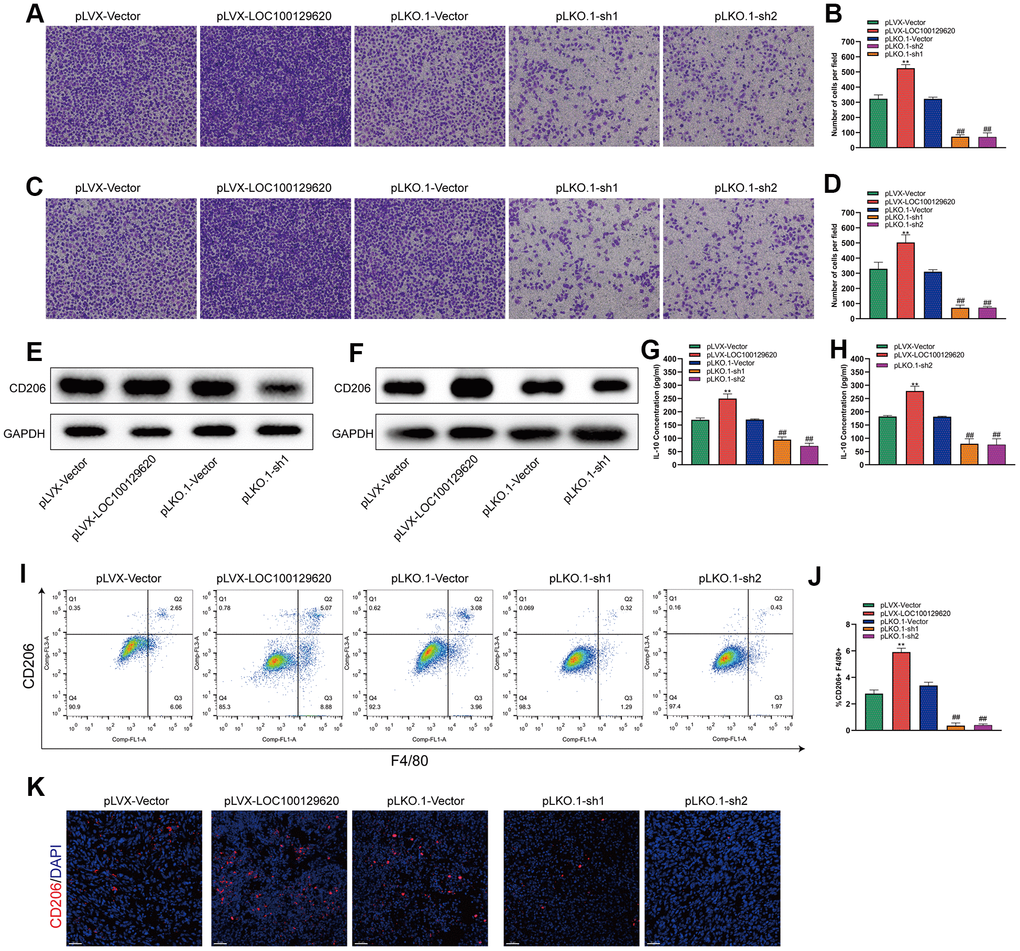 Tumor-associated macrophages (TAMs) play an important role in the tumor microenvironment. Two subtypes that can polarize each other exist: the M1 type (classically activated macrophages) and the M2 type (alternatively activated macrophages). M1 type TAMs play a role in inhibiting tumor growth, while M2 type TAMs promote and support the occurrence and development of tumors. In a specific tumor microenvironment, M2 type TAMs occupy a dominant position and promote tumor development. The Transwell assay results show that overexpression of LOC100129620 could increase the stimulatory effect of U2OS cells on the invasion of RAW264.7 cells, while knockdown of LOC100129620 could reduce the stimulatory effect of RAW264.7 cells on the invasion of endothelial cells (Figure 8A, 8B). Similar results were obtained in MG63 cells (Figure 8C, 8D). Overexpression of LOC100129620 in U2OS cells promoted the expression of CD206, which is an important marker for M2 type TAMs in RAW264.7 cells; however, LOC100129620 knockdown in U2OS inhibited the expression of CD206 in RAW264.7 cells (Figure 8E). Similar results were obtained in MG63 cells (Figure 8F). LOC100129620 overexpression promoted IL-10 expression in osteosarcoma cells, and LOC100129620 knockdown inhibited IL-10 expression in osteosarcoma cells (Figure 8G, 8H). To extend our in vitro observations, we investigated whether LOC100129620 could regulate the infiltration and M2 polarization of macrophages, and thus facilitate osteosarcoma cell growth, in vivo. Flow cytometry analysis showed that LOC100129620 overexpression promoted the infiltration and M2 polarization of macrophages in osteosarcoma tumor tissue, and LOC100129620 knockdown reduced the infiltration and M2 polarization of macrophages in osteosarcoma tumor tissue (Figure 8I, 8J).