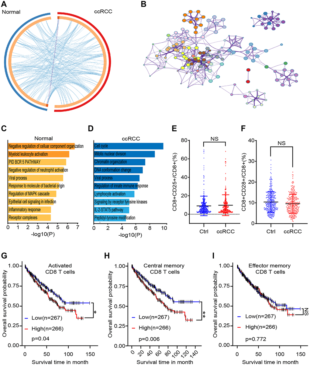 To explore the potential changes of CD8+ T lymphocytes in ccRCC patients, we obtained peripheral blood samples from 5 healthy people and 5 ccRCC patients. CD8+ T lymphocytes were sorted by flow cytometric and differential genes were analyzed by gene chip before and after co-culturing. There were only 3 common differential genes between these two groups (log|FC|> 2, p < 0.05) (Figure 2A). To simulated biological function of differential genes, we purified peripheral blood mononuclear cells of BALB/c mice and co-cultured with/without RAG cells (renal carcinoma cell line from BALB/c mice) for 48 hours. We analyzed different genes of CD8+ T cells and cluster analysis showed that the pathways for gene enrichment were basically inconsistent (Figure 2B, 2C). We analyzed differential genes of CD8+ T cells, which were accumulated in several signaling pathways (Figure 2D). The gene enriched signaling pathways suggested that there were statistical differences in CD8+ T cells, which may be caused by different cell subpopulations. To verify our hypothesis, we compared peripheral activated CD8+ T lymphocytes (CD8+CD25+ T lymphocytes) of healthy people with ccRCC patients and found that there are no significant differences (Figure 2E). It has been studied that the equilibrium between CD8+CD28+ T lymphocytes and CD8+CD28- T lymphocytes are significant in the mechanisms of pathogenesis. The result showed that there were no statistical differences of CD8+CD28+ T lymphocytes was found between healthy people and ccRCC patients (Figure 2F). As for ccRCC immune environment, activated CD8+ T lymphocytes (CD25+CD8+ T lymphocytes) (p = 0.0398) (Figure 2G) and central memory CD8+ T cells (CD45RO+CD62L+CD8+ T cells) (p = 0.0057) (Figure 2H) but effector memory CD8+ T cells (CD45RO+CD62L-CD8+ T lymphocytes) (p =0.77165) (Figure 2I) indicated worse prognosis of ccRCC patients. These results illustrated that immune status of CD8+ T lymphocytes were potential differences between healthy people and ccRCC patients.