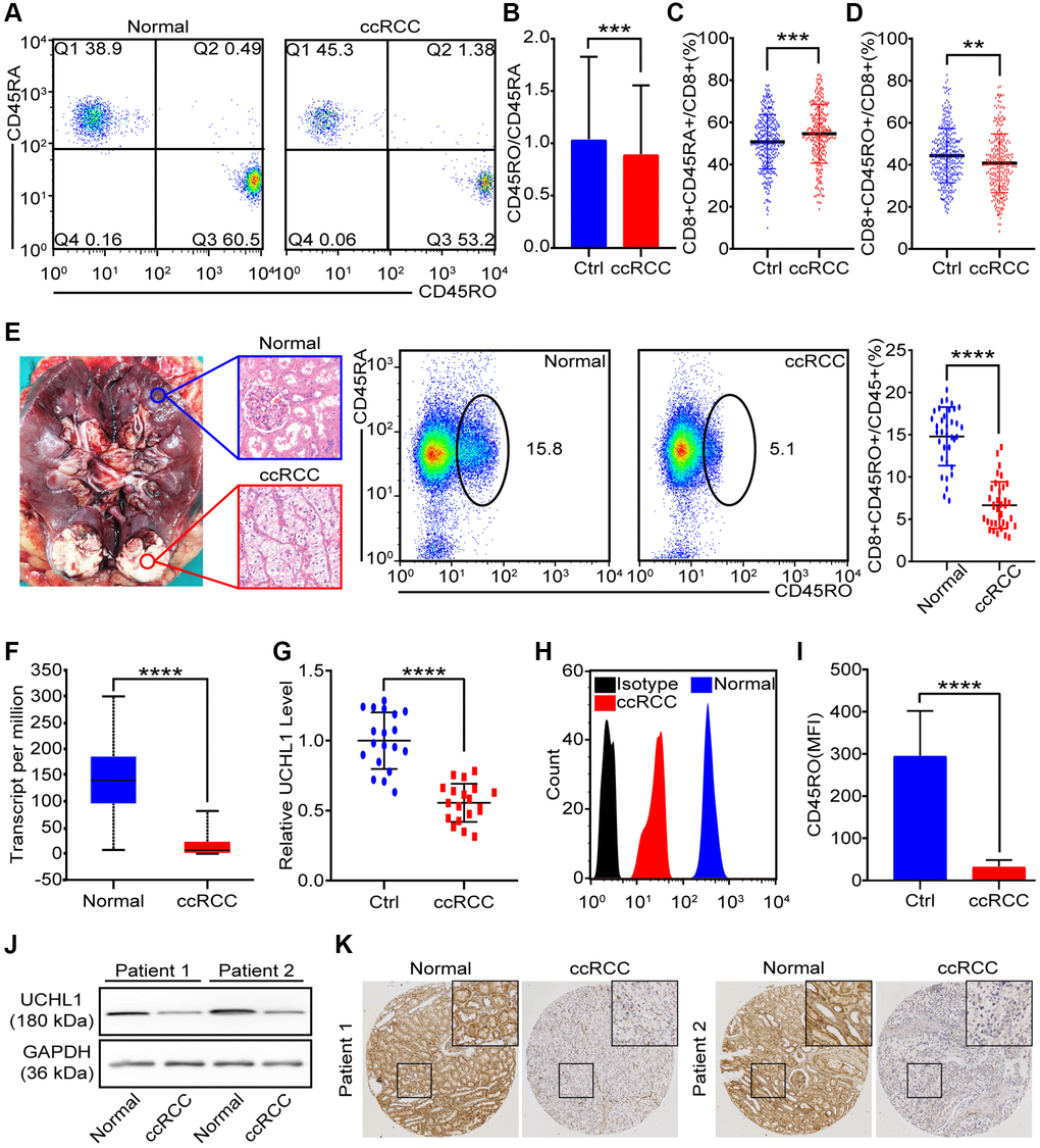 The expression of different CD45 isoforms depends on differentiation and stimulation of cells. In homo sapiens, CD45RO and CD45RA are thought to be memory and naive T lymphocytes in respective. Flow cytometry was utilized to distinguish CD45RO+CD8+ T lymphocytes /CD45RA+ CD8+ T lymphocytes (Figure 3A). The statistical data of CD45RO+CD8+ T lymphocytes and CD45RA+CD8+ T lymphocytes showed that level of CD45RA+CD8+ T lymphocytes in ccRCC patients (n = 274) was lower than healthy people (n = 350) (p = 0.0037) (Figure 3B) and proportion of CD45RO+CD8+ T cells in ccRCC patients (n = 274) was higher than healthy people (p = 0.0057) (Figure 3C). Ratio of CD45RO+CD8+ T lymphocytes /CD45RA+ CD8+ T lymphocytes was decreased in the circulation of ccRCC patients (n = 35, p < 0.001) (Figure 3D). Combined with previous results (Figure 2G, 2H, 2I), it was indicated that central memory CD8+ T lymphocytes decrease in ccRCC tissues. To compare CD45RO/CD45RA level in ccRCC with the one in para-carcinoma tissues, we collected pathologically confirmed para-carcinoma tissues and malignant ccRCC tissues for follow-up experiments. The statistical data showed that proportion of CD45RO+ CD8+ T cells in para-carcinoma tissues were significantly higher than ccRCC (p < 0.001) (Figure 3E). In order to further confirm the results, we analyzed UCHL1 (gene name of CD45RO) of ccRCC through bioinformatics and qRT-PCR. The results showed that both of TCGA data (Figure 3F) and clinical data (Figure 3G) indicated that UCHL1 level reduced in ccRCC tissues compare to para-carcinoma tissues. As for protein level, flow cytometry was utilized to test CD45RO fluorescence intensity of CD8+ T lymphocytes (Figure 3H) and statistical data showed that Median Fluorescence Intensity (MFI) of CD45RO decreased in CD8+ T cells from ccRCC tissues (p < 0.0010) (Figure 3I). Western blot (Figure 3J) and IHC (Figure 3K) assays showed that protein level of CD45RO decrease in CD8+ T cells from ccRCC tissues. These results showed that CD45RO+CD8+ T lymphocytes increased in not merely peripheral blood but also the tissues of ccRCC. Both of gene and protein levels of CD45RO increased in ccRCC tissues.