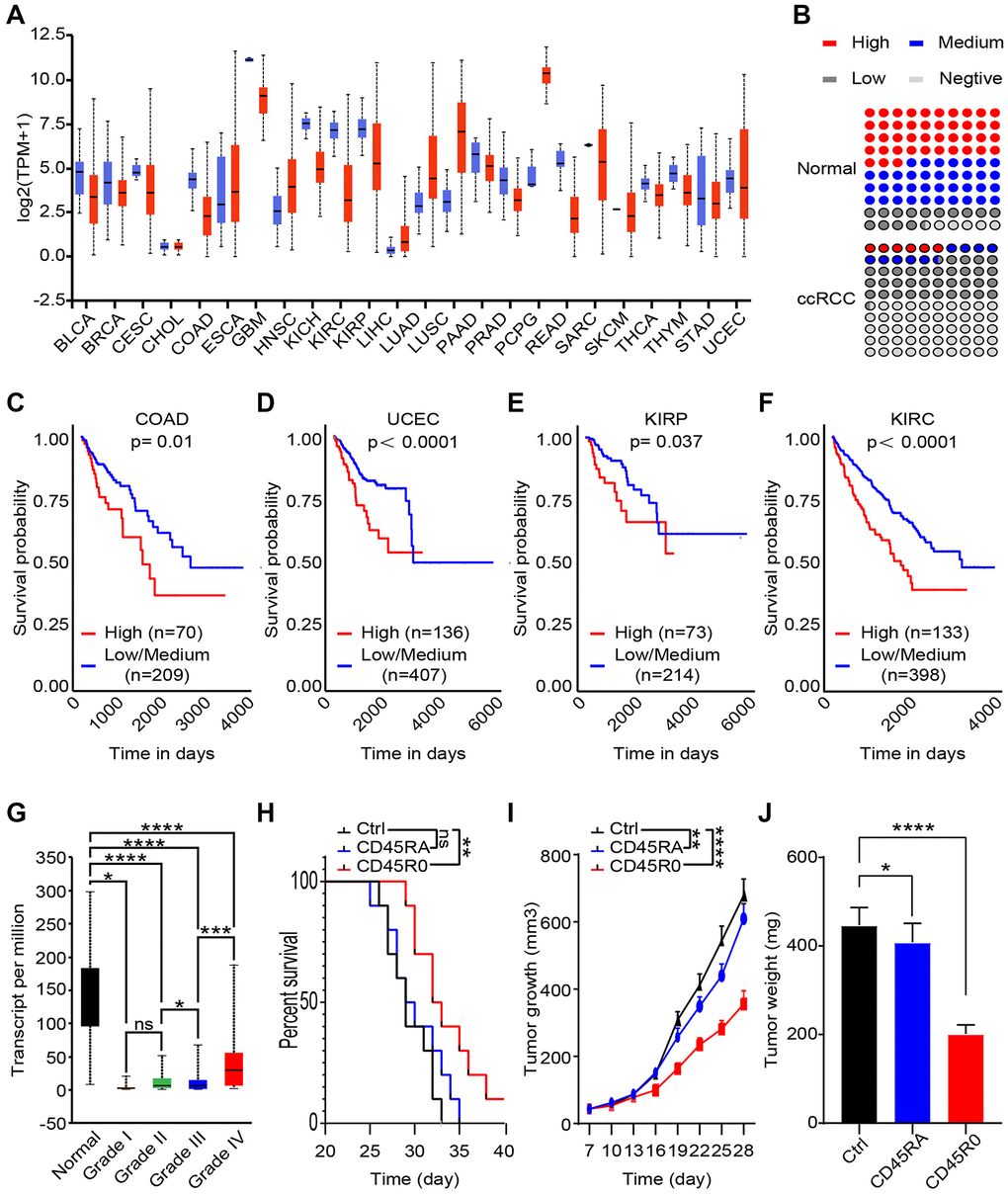 To assess the specificity and universality of UCHL1, we analyzed transcript level of UCHL1 in 24 cancers and corresponding normal tissues. As shown, UCHL1 transcript levels were almost lower in malignant tissues than the normal ones (Figure 4A). As for protein level, we collected 100 para-carcinoma tissues and malignant tissues from ccRCC patients; IHC positive rate of CD45RO in ccRCC tissues (High: 5.8%; Medium: 9.9%; Low: 35.0%; Negative: 49.4%) was lower than normal renal tissues (High: 43.1%; Medium: 37.1%; Low: 14.3%; Negative: 5.4%) (Figure 4B). To further investigate the clinical prognostic role of UCHL1, we analyzed the TCGA data by bioinformatics method. As shown, colonic adenocarcinoma (COAD) (Figure 4C), uterine corpus endometrial carcinoma (UCEC) (Figure 4D), kidney renal papillary cell carcinoma (KIRP) (Figure 4E) and kidney renal clear cell carcinoma (KIRC) (Figure 4F) patients with high UCHL1 levels had a poor prognosis. It indicated that UCHL1 can be used as a potential predictor of tumor prognosis. We further explore the TCGA database and uncloaked that although UCHL1 statistically decreased in ccRCC compare to the normal, it was gradually increasing consistent with tumor grade (Figure 4G). It revealed that though there were more active CD8+ T lymphocytes in advanced ccRCC malignancies, these immune cells were difficult to prevent poor prognosis. To clarify the immune function of CD45RO+CD8+ T lymphocytes and CD45RA+CD8+ T lymphocytes, we injected 1 × 108 CD45RO+CD8+ T lymphocytes or CD45RO+CD8+ T lymphocytes per week after ccRCC model was successfully established. Cancer progression was recorded, and the results showed that both of CD45RO+CD8+ T cells and CD45RA+CD8+ T cells had anti-tumor effect (prolong survival time, limiting tumor growth and reducing tumor weight), while CD45RO+CD8+ T cells treated was more obvious (Figure 4H, 4I, 4J).