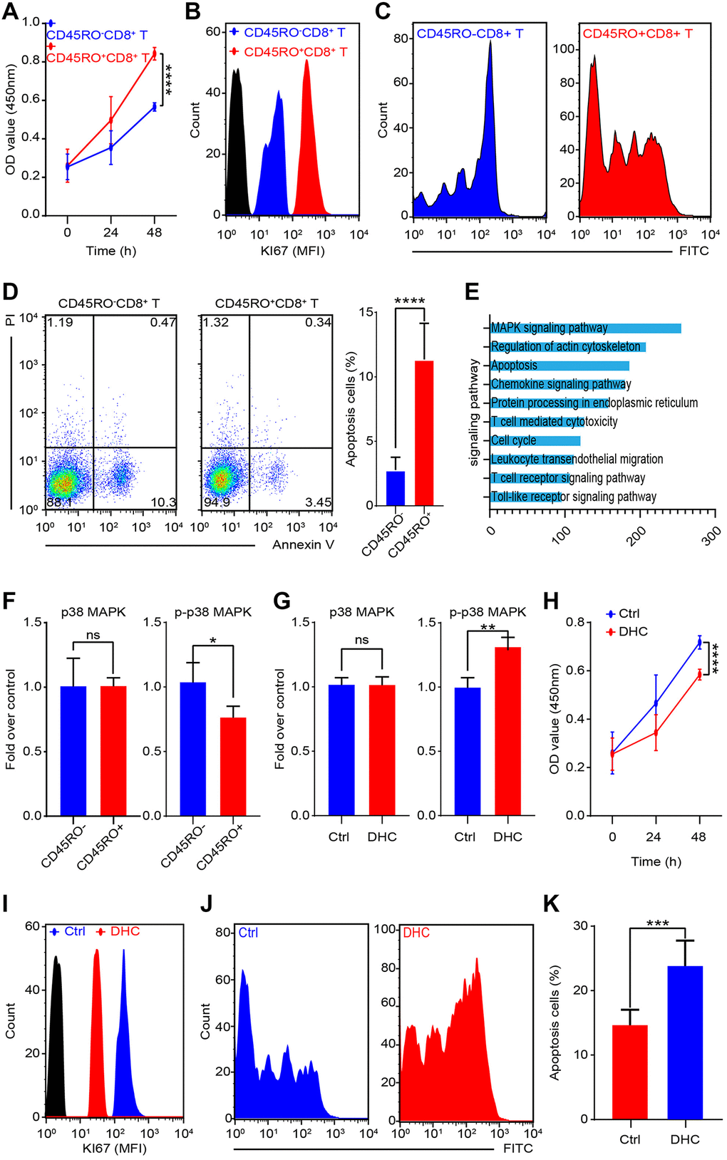 To compare differences of CD45RO+CD8+T lymphocytes and CD45RO-CD8+T lymphocytes, we collected PBMCs from circulation of ccRCC patients. CD45RO+CD8+T lymphocytes and CD45RO-CD8+T lymphocytes were sorted by flow cytometry and prepared for following experiments. Proliferation rates of CD45RO+CD8+T lymphocytes and CD45RO-CD8+T lymphocytes were tested by CCK8 assay at 0, 24 and 48 hours (Figure 5A). Ki67, a crucial proliferation related protein, can reflect the proliferation rate of cells. As for Ki67 protein level, flow cytometry was utilized to test CD45RO fluorescence intensity of CD45RO+CD8+T lymphocytes and CD45RO-CD8+T lymphocytes (Figure 5B) and changes of CFSE fluorescence intensity showed that proliferation rate of CD45RO+CD8+T lymphocytes was faster than CD45RO-CD8+T lymphocytes (Figure 5C). We combined PI and Annexin V to tested apoptosis status by flow cytometry and the statistics elucidated that apoptosis proportion rates of CD45RO−CD8+T lymphocytes were higher than CD45RO+CD8+T lymphocytes (Figure 5D). These results indicated that in ccRCC immune environment, CD45RO+CD8+T lymphocytes were more proliferative but less apoptotic than CD45RO-CD8+T lymphocytes. To explore detail mechanisms, we analyzed the different gene between CD45RO+CD8+T lymphocytes and CD45RO−CD8+T lymphocytes and genes cluster analysis showed that these different gene were enriched in MAPK signaling pathways (Figure 5E). To verify this mechanism, we tested the protein levels of p38/MAPK and p-p38/MAPK and the statistics showed that p-p38/MAPK protein levels were lower in CD45RO+CD8+T lymphocytes compare to CD45RO−CD8+T lymphocytes (Figure 5F). Dehydrocorydaline chloride is an activator of MAPK signaling pathway. To test the activation effect, we treated CD45RO+CD8+T lymphocytes with Dehydrocorydaline chloride (500 nM) for 24 hours and tested phosphorylation of p38/MAPK. The results showed that Dehydrocorydaline chloride effectively increased phosphorylation of p38/MAPK (Figure 5G). To evaluate the effect of p38/MAPK on proliferation, CCK8 assay was used to test the viability at 0, 24 and 48 hours. Proliferation rate of CD45RO+CD8+T cells decreased with dehydrocorydaline chloride treatment (Figure 5H). After treated by dehydrocorydaline chloride for 48 hours, Ki67 fluorescence intensity of CD45RO+CD8+T cells was decreased (Figure 5I). CFSE labeled CD45RO+CD8+T lymphocytes were cultured for 96 hours and flow cytometry showed that the Fluorescence decay was faster after Dehydrocorydaline chloride treated (Figure 5J). As for apoptosis, we treated CD45RO+CD8+T cells with Dehydrocorydaline chloride for 48 hours and tested apoptosis through flow cytometry. The proportion of apoptosis CD45RO+CD8+T lymphocytes were increased after Dehydrocorydaline chloride treated (Figure 5K).