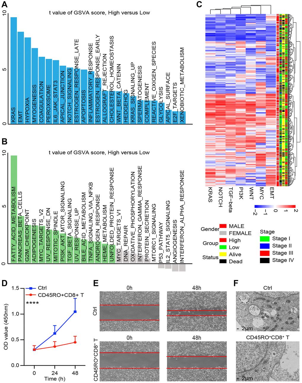 CD8+CD45+ T cells perform the crucial role in caner immune environment. In order to assess the impact of CD45RO+CD8+ T cells in ccRCC cell lines, we co-cultured Caki-2 with CD45RO+CD8+ T cells for 48 hours, which were pre-stimulated with ccRCC cells for 24 hours. Gene chip was used to test different genes of Caki-2 with/without CD45RO+CD8+ T cells co-cultured. As shown, a According to TCGA database, we divided ccRCC patients into CD45RO+CD8+ T cells co-cultured group and control group. Upregulated genes were enriched in KRAS, EMT and hypoxia related pathways (Figure 6A) while genes enriched in fatty acid metabolism were downregulated, pancancers beta cells and G2M checkpoint related pathways (Figure 6B). We further divided ccRCC patients into CD45RO high group and CD45RO low group. Gene chips of ccRCC tissues showed that CD45RO low group tended to have higher score in EMT, MYC, WNT, PI3K TGF-beta, NOTCH and KRAS, which were closely related to proliferation and metastasis (Figure 6C). According to analysis results, we tested whether CD45RO+CD8+ T cells had an effect on the biological function of cancer cells. CD45RO+CD8+ T lymphocytes were stimulated first with plate-bound αCD3/CD28 for 3 d and then co-cultured with Caki-2 cells. We tested viability of Caki-2 cells at 0, 24 and 48 hours and found that CD45RO+CD8+ T cells inhibited proliferation of Caki-2 cells (Figure 6D). The results showed that CD45RO+CD8+ T inhibited metastasis pathway, such as EMT, we subsequently co-cultured CD45RO+CD8+ T lymphocytes with Caki-2 cells for 48 hours and tested invasion ability by wound healing experiments. The results demonstrated that CD45RO+CD8+ T lymphocytes inhibited migration ability of Caki-2 cells (Figure 6E). The gene chip also showed that metabolism related pathways changed a lot. After co-cultured with CD45RO+CD8+ T cells for 48 hours, Caki-2 cells were obtained and scanned using electron microscope. The pictures showed that Electron microscope restricted autophagy and mitochondrial aggregation (Figure 6F). These results showed that CD45RO+CD8+ T cells inhibit proliferation, apoptosis and metabolism of ccRCC cells through multiple ways.