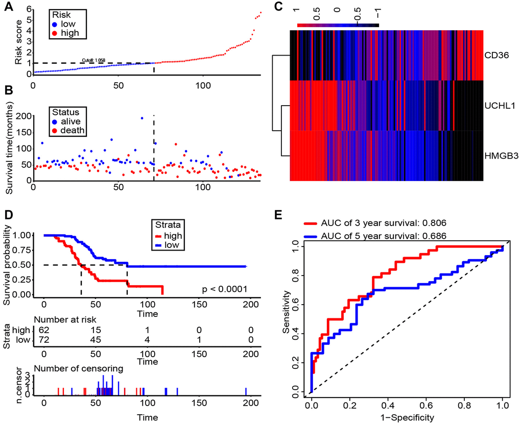 Accumulating evidence has shown that UCHL1 is recognized as a promising biomarker for prognosis and diagnosis of ccRCC respectively. Therefore, clarifying the clinical significance of UCHL1 and related genes, CD36 and HMGB3, in ccRCC would be of great significance, especially their joint effect. via the risk score generated by multivariate Cox model, we can see patients with higher expression level of CD36, lower expression level of UCHL1 and HMGB3 have poorer survival time (Figure 8A, 8B). The heat map showed that the consistency was good of UCHL1, CD36 and HMGB3 in ccRCC patients (Figure 8C). We further identified the optimal cut-off value (risk score = 1.058) for the classification of two risk groups and a significant differential survival outcome is displayed (Log-rank P < 0.0001) (Figure 8D). ROC analysis of 3- and 5-year OS were performed and AUCs were 0.806 and 0.686, respectively (Figure 8E). In general, our results suggested that UCHL1-CD36-HMGB3 could serve as a potential diagnostic biomarker and therapeutic target respectively for ccRCC.