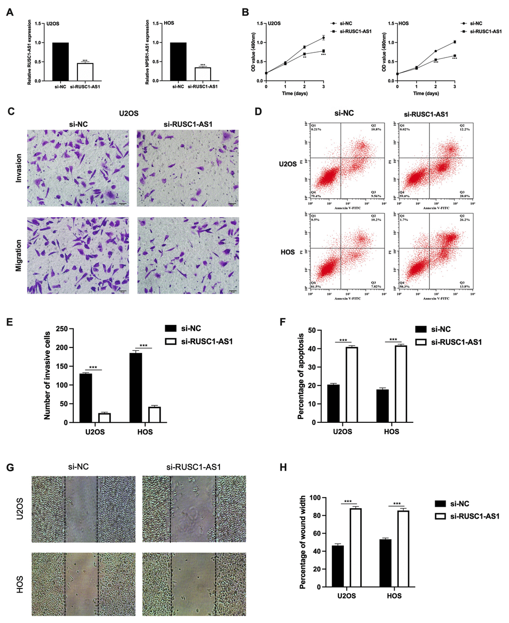 As RUSC1-AS1 was found upregulated in osteosarcoma cells, we further observed its function. SiRNA was transfected into U2OS and HOS cells for RUSC1-AS1 knockdown. The expression of RUSC1-AS1 was significantly lower after si-RUSC1-AS1 transfection in both U2OS and HOS cells confirmed by RT-qPCR (Figure 2A). After RUSC1-AS1 knockdown, we found that cell proliferation was significantly inhibited after 48 h transfection measured by CCK-8 assay (Figure 2B). In addition, the results of the transwell invasion assay and wound healing assay suggested that RUSC1-AS1 knockdown weakened the invasive ability of osteosarcoma cells (Figure 2C, 2E, 2G–2H). In contrast, after RUSC1-AS1 inhibition, cell apoptosis was significantly increased in the si-RUSC1-AS1 group compared to the si-NC group (Figure 2D, 2F).
