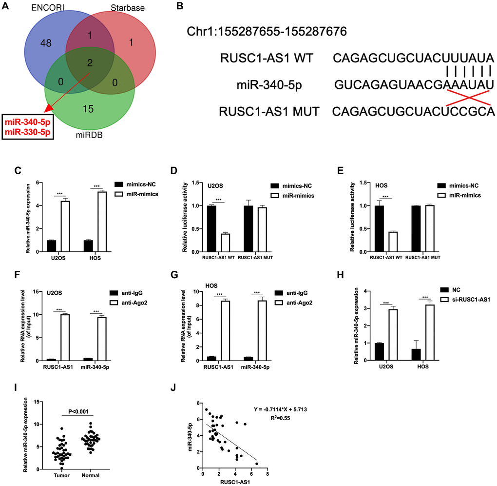 LncRNA often serves as a sponge of miRNA, thus regulates the expression of target genes [13]. Therefore, we used website tools (Starbase, ENCORI and miRDB) to predict and look for miRNAs that might bind to RUSC1-AS1. As shown in Figure 3A, miR-330-5p and miR-340-5p were the results of the intersection of three prediction tools, suggesting that these two miRNAs have a high possibility of binding with RUSC1-AS1. In subsequent experiments, we found that the expression of miR-340-5p was significantly decreased in osteosarcoma patient samples and cell lines, and it was inversely correlated with the expression of RUSC1-AS1 (Figure 3H–3J). Therefore, we speculated that there was a direct binding between miR-340-5p and RUSC1-AS1. To validate our hypothesis, luciferase reporter assay and RIP assay were conducted. The predicted binding site of RUSC1-AS1 and miR-340-5p was shown in Figure 3B. The transfection efficiency of miR-340-5p mimics (miR-mimics) was tested by RT-qPCR (Figure 3C). As shown in Figure 3D–3E, relative luciferase activity was significantly decreased in U2OS and HOS cells co-transfected with RUSC1-AS1 WT plasmid and miR-mimics, suggesting a direct binding of RUSC1-AS1 and miR-340-5p. Their binding was further validated by RIP assay (Figure 3F–3G). These results confirmed that miR-340-5p was a direct target of RUSC1-AS1.