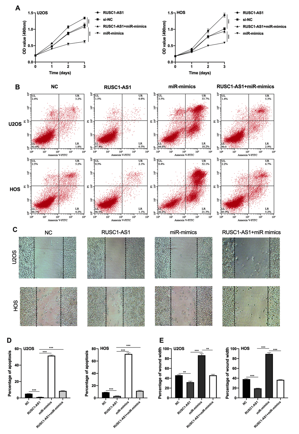 Next, we tried to explore whether RUSC1-AS1 promotes osteosarcoma progression through miR-340-5p. CCK-8 assay, flow cytometry apoptosis assay and wound healing assay were conducted using U2OS/HOS cells or U2OS/HOS cells transfected with RUSC1-AS1 plasmid, miR-mimics or RUSC1-AS1+miR-mimics. The results showed that the miR-mimics group had the least cell proliferation and the most cell apoptosis. The RUSC1-AS1 group showed the opposite result. There was no significant difference in the proliferation and apoptosis of osteosarcoma cells co-transfected with miR-mimics and RUSC1-AS1 plasmid compared with the control group (Figure 4A–4D). These results suggested that miR-mimics partially counteracted the oncogenic effects caused by RUSC1-AS1, implying that the RUSC1-AS1 exerts its oncogenic role through regulating miR-340-5p.