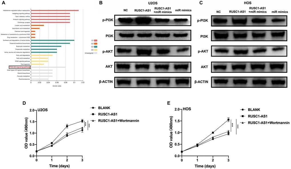 To further explore the downstream signaling pathway of RUSC1-AS1/miR-340-5p, we used the miRDB website tool to predict the downstream target genes of miR-340-5p. We then performed KEGG enrichment analysis using these genes. The results showed that many target genes were enriched in the PI3K/AKT signaling pathway (Figure 5A). Therefore, we used U2OS/HOS cells and U2OS/HOS cells transfected with RUSC1-AS1 plasmid, miR-mimics, or RUSC1-AS1 +miR-mimics to perform Western Blot analysis. As shown in Figure 5B–5C, p-AKT and p-PI3K protein expression was significantly decreased in the miR-mimics group, while the opposite results were shown in the RUSC1-AS1 group. There was no significant difference in p-AKT and p-PI3K protein expression in the group co-transfected with miR-mimics and RUSC1-AS1 plasmid compared with the control group. To further verify that RUSC1-AS1 promoted tumor growth through the PI3K/AKT pathway, U2OS/HOS cells overexpressing RUSC1-AS1 were treated with the PI3K inhibitor wortmannin. The results showed that inhibition of the PI3K signaling pathway in RUSC1-AS1 overexpressed cells could effectively inhibit tumor cell proliferation induced by RUSC1-AS1 (Figure 5D, 5E). These results suggested that RUSC1-AS1 promotes osteosarcoma progression through binding with miR-340-5p to activate PI3K/ AKT signaling pathway.