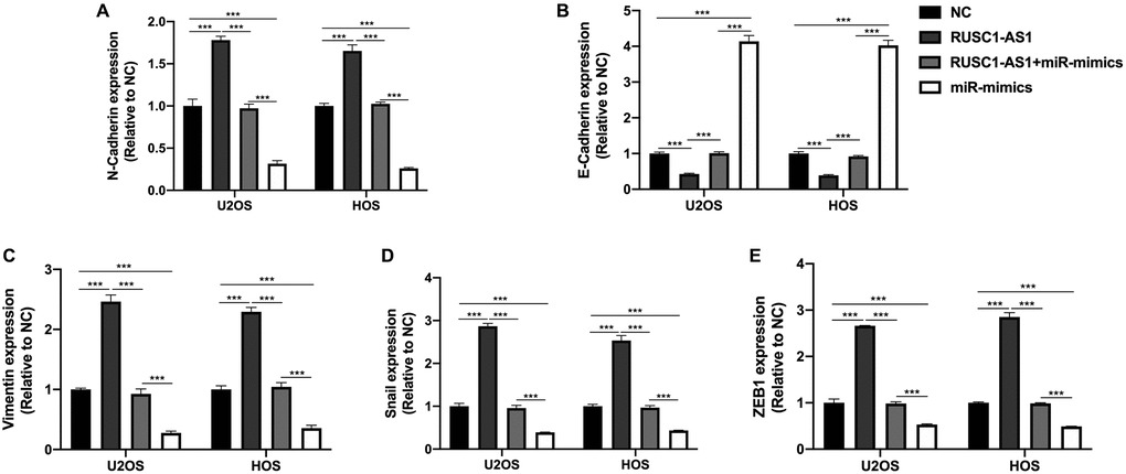 EMT process was reported to be associated with the progression of osteosarcoma [14]. Therefore, we wanted to explore the effect of RUSC1-AS1/miR-340-5p on the EMT of osteosarcoma cells. We detected EMT-related genes N-cadherin, E-cadherin, Vimentin, Snail and ZEB1 in U2OS/HOS cells by RT-qPCR. As shown in Figure 6, we found that the expression of N-cadherin, Vimentin, Snail, and ZEB1 in RUSC1-AS1 transfected cells was significantly increased compared with the NC group. In contrast, E-cadherin expression was decreased considerably, suggesting that RUSC1-AS1 could promote EMT in osteosarcoma cells. The opposite results were seen in the cells transfected with miR-mimics. There was no significant difference in EMT-related protein expression between the RUSC1-AS1+miR-mimics group and the control group, indicating that RUSC1-AS1 acts as an oncogene by promoting EMT in osteosarcoma, and this process is partly through its direct binding with miR-340-5p.