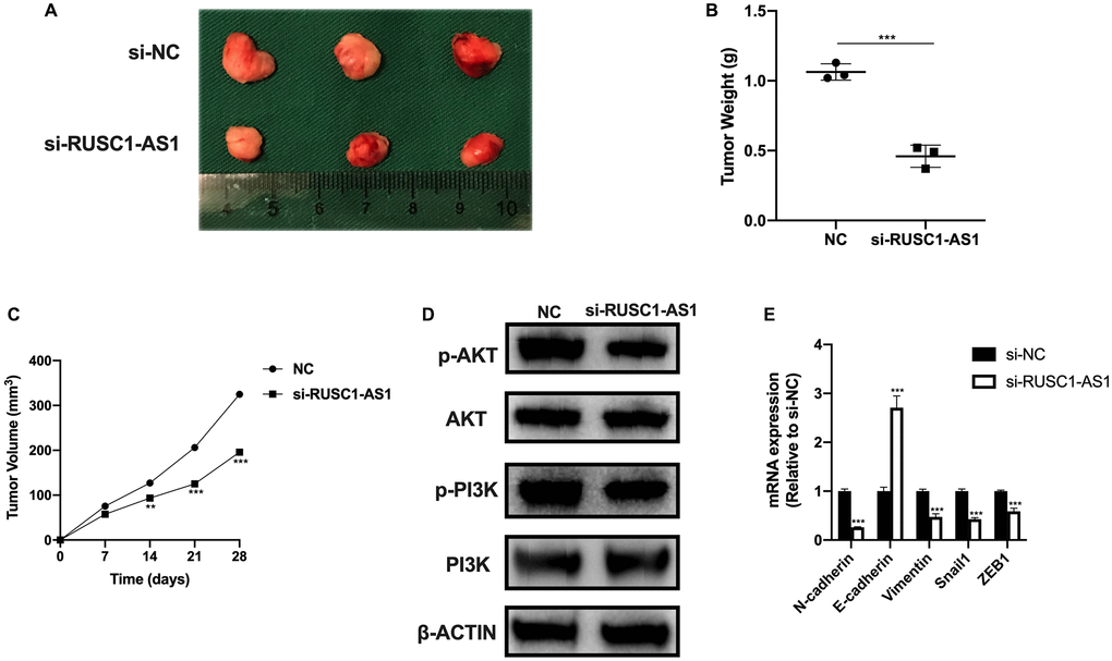 We also investigated the effect of RUSC1-AS1 on tumor growth in vivo. The results of in vivo experiment were consistent with those of in vitro experiment. Tumor growth was significantly reduced in the RUSC1-AS1 knockdown group compared with the si-NC group (Figure 7C). On day 28 of the in vivo experiment, we sacrificed the mice and found that the tumor volume and mass in the RUSC1-AS1 knockdown group were significantly decreased than those in the si-NC group (Figure 7A–7B). Western Blot analysis was used to detect the protein expression of the tumor cells. It was found that the PI3K/AKT signaling pathway was significantly inhibited in the si-RUSC1-AS1 group (Figure 7D). These results suggested that RUSC1-AS1 can promote tumor growth in vivo. In addition, we used qPCR to detect the mRNA expression of EMT-related genes. The results showed that compared with the si-NC group, the expressions of N-cadherin, Vimentin, Snail1, and ZEB1 in the si-RUSC1-AS1 group were significantly decreased. In contrast, the expression of E-cadherin was significantly increased (Figure 7E), suggesting that inhibition of RUSC1-AS1 could effectively inhibit the EMT process of tumor cells.