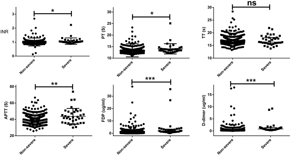 The differences in coagulation parameters between severe and non-severe patients on hospital admission are shown in Table 2. On hospital admission, the severe patients had a slightly higher INR (1.02 vs 0.99, p = 0.016), PT (13.6s vs 13.2s, p = 0.019), APTT (42.1s vs 38.4s, p = 0.019), whereas remarkably higher FDP (2.03 vs 0.65 ug/ml, p < 0.001) and D-dimer (0.87 vs 0.27 ug/ml, p < 0.001) than non-severe patients. Abnormal INR (11.1% vs 2.0%, p < 0.001), PT (30.6% vs 7.1%, p < 0.001), APTT (47.2% vs 14.3%, p < 0.001), TT (5.6% vs 0.7%, p = 0.002), FDP (13.9% vs 1.9%, p < 0.001), and D-dimer (69.4% vs 18.1%, p < 0.001) were commonly observed in severe patients, compared with non-severe patients. A scatter plots of the coagulation values between severe and non-severe patients on hospital admission are shown in Figure 1.