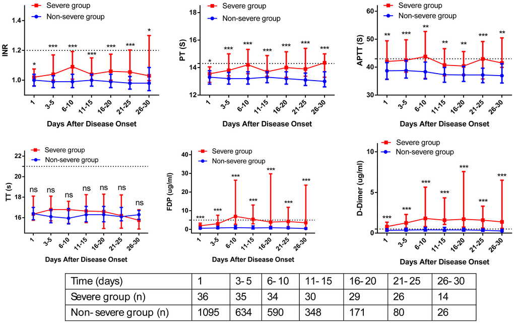 This study aimed to describe the dynamic changes of coagulation parameters during hospitalization, and evaluate the association between longitudinal coagulation parameters abnormalities and clinical outcomes of COVID-19 patients. The strength of this study included its large sample size, and the longitudinal coagulation parameters description at admission and during hospitalization. Although the differences in coagulation parameters were not always striking (some moving within the ULN), Figure 2 clearly showed that severe COVID-19 patients had higher levels of coagulation parameters than non-severe patients from baseline to 30 days after admission. Figure 3 clearly showed that peak hospitalization PT, FDP, and D-dimer were associated with mortality of COVID-19 patients.
