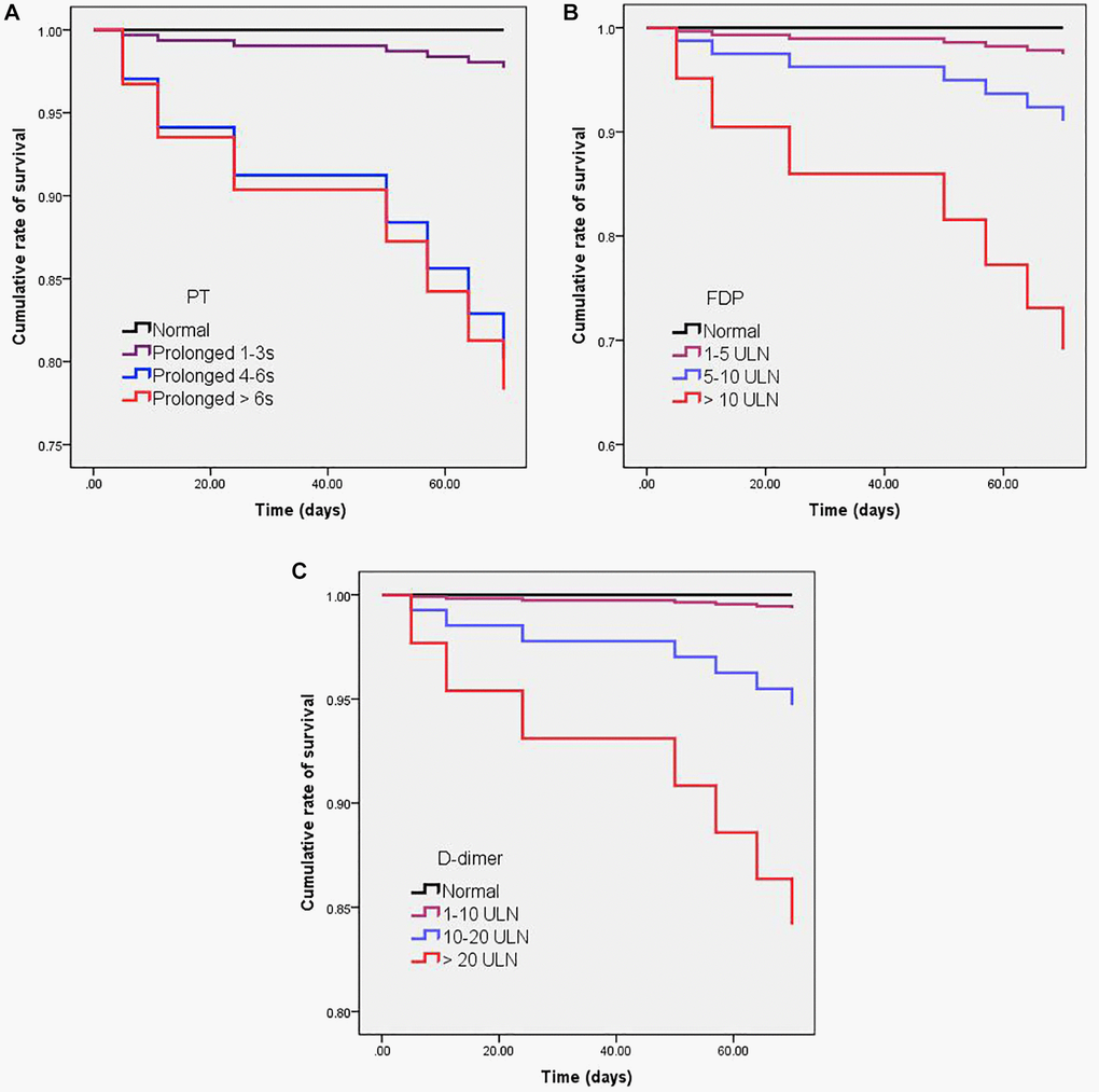 The association between admission and peak hospitalization coagulation parameters and clinical outcomes is summarized in Table 6. On multivariate analysis, age > 60 years, male, obesity, comorbidity, abnormal D-dimer on hospital admission, and abnormal peak hospitalization PT, APTT, FDP, and D-dimer were associated with severe COVID-19 (OR > 1; p < 0.05). The dynamic profile of coagulation parameters in patients by severity of COVID-19 is illustrated in Figure 2. Compared with non-severe patients, severe COVID-19 patients had markedly higher levels of INR, PT, APTT, FDP, and D-dimer from baseline to 30 days after admission (p < 0.05). On multivariate analysis, age > 60 years, obesity, comorbidity, and abnormal peak hospitalization PT (OR = 3.32; 95% CI 1.43–24.94; p = 0.001), FDP (OR = 2.63; 95% CI 1.16–5.57; p = 0.032), and D-dimer (OR = 3.21; 95% CI 1.32–21.65; p = 0.026) were associated with death. Kaplan-Meier curves for cumulative rate of survival during hospitalization in patients with different level of PT (a), FDP (b), and D-dimer (c) are illustrated in Figure 3.