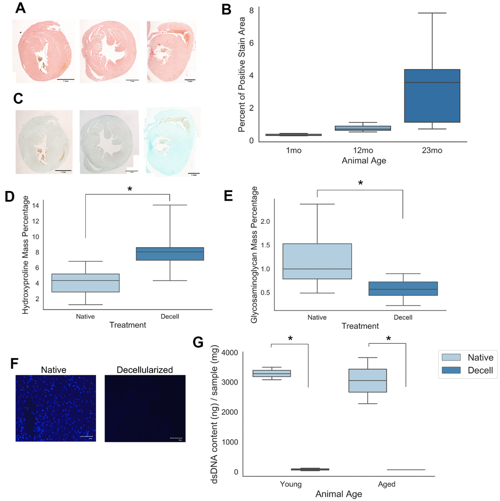 To assess the impact of cardiac extracellular matrix (cECM) age on naïve macrophage responses, it was necessary to decellularize native cardiac tissue to provide a cell free scaffold which preserved matrix protein content. A skeletal muscle decellularization protocol from Wolf et al [27] with additional blood clot dissociation steps was chosen to accomplish this goal. Successful decellularization of native tissue is characterized by retention of bioactive matrix proteins while sufficiently removing DNA content and cellular antigens from the native tissue, as these factors will induce confounding immune responses in macrophages [28]. Picrosirius red staining (Figure 1A) of collagen coupled with Alcian blue staining (Figure 1C) of sulfated proteoglycans demonstrated a qualitative increase in collagen and glycosaminoglycan content with increasing age in native cardiac tissues samples. Semi-quantitative analysis of the percent positive area per field of view for picrosirius red stained cardiac sections also demonstrated a mean increase in percent positive staining area with increased sample donor age (Figure 1B). Following decellularization, samples were found to be comprised of a significantly increased mass percentage of hydroxyproline, indicative of the increased contribution of collagen content to the overall mass of the decellularized cECM scaffold (Figure 1D) following removal of the cellular content. Conversely, glycosaminoglycan mass percentage was found to significantly decrease following decellularization (Figure 1E).