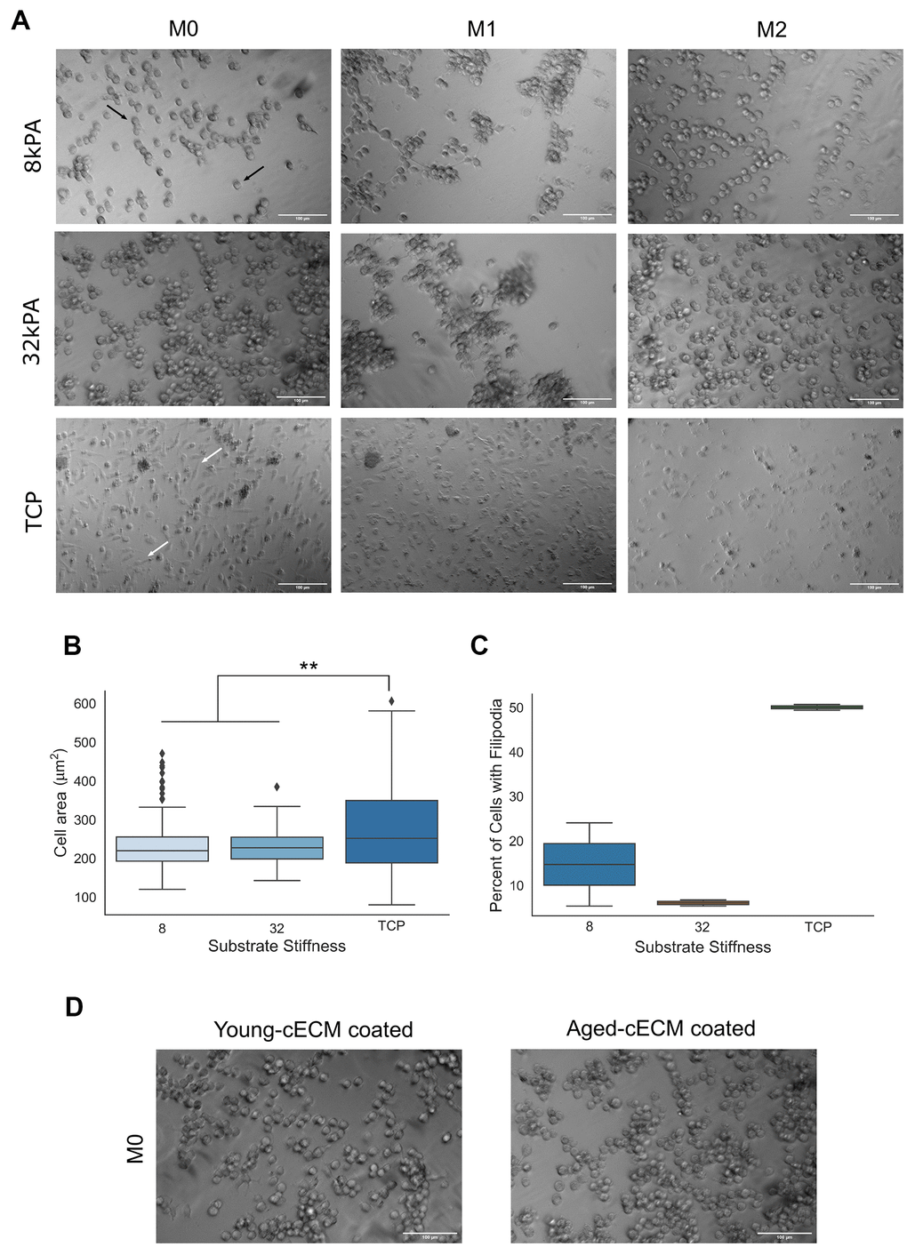 In comparison, it was observed that less stiff gel culture groups tended to promote more round macrophage morphologies(Figure 2A, white arrows), significantly decreased cellular adhesion area (Figure 2B), and a decreased percentage of cells per field of view displaying filopodia as compared to macrophages cultured on tissue culture plastic (Figure 2C). In order to assess if the age of the mouse from which the cECM coating was derived affected macrophage morphology, macrophages were seeded onto 32kPA gels coated with decellularized cECM isolated from young or aged mice. It was noted that cell morphology did not appear substantially different between young or aged cECM coated gels, suggesting that substrate stiffness may be a greater predictor of macrophage morphological features than the age of the mice from which the decellularized cECM was isolated (Figure 2D).