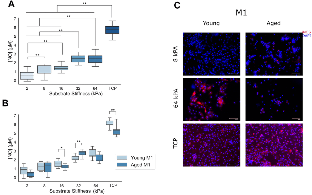 These findings have several important implications for both biomaterial design as well as for the application of cardiac extracellular matrix-derived therapeutics. First, the results of the present study highlight the importance of matching tissue elastic modulus in therapeutics which do not seek to induce excessive macrophage activation and potential chronic inflammatory signaling in the case of non-degradable material implants, as a timely re-polarization of macrophages from a predominantly M1 response to a more alternatively activated M2 population is a hallmark of functional biomaterial integration [2]. Additionally, the significant reduction of naïve macrophage priming observed in aged cECM treatment coupled with the tendency of aged cECM to upregulate pro-inflammatory gene transcripts following IL-4 treatment suggests that aged cECM may be a less instructive material relative to younger source age cECM therapeutic products and may promote chronic inflammatory processes even in the presence of anti-inflammatory signaling cues. Interestingly, excessive radical oxidant secretion through the inducible nitric oxide synthase pathway has also recently been implicated as a mechanism for the acquisition of the heart failure with preserved ejection phenotype, with macrophages playing an important role in promoting cardiac diastolic dysfunction [29, 30]. The results of this study implicate matrix stiffening as a potential mechanism for the macrophage mediated acquisition of diastolic dysfunction through the increasing promotion of radical oxidant secretion through the inducible nitric oxide synthase pathway in aging populations. Additionally, the reduction in the ability of aged cardiac extracellular matrix to polarize macrophages both at baseline and in the presence of canonical Th1 or Th2 cytokine cues suggests that the aging cardiac microenvironment may promote chronic cardiac inflammatory processes through both an increase in pro-inflammatory macrophage phenotype and function induced through exposure to stiffened cardiac tissue as well as through a reduced ability to shift macrophage polarization towards constructive phenotypes following inflammatory phenotypic polarization.