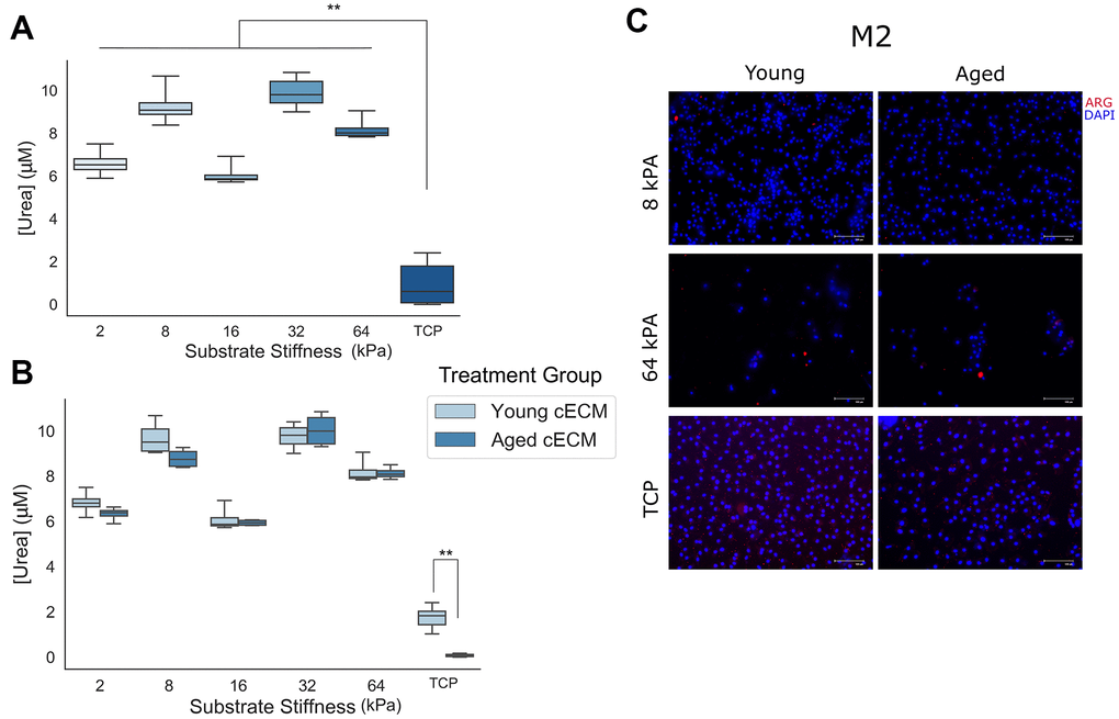 In order to study the ability of naïve macrophages to polarize to M2 phenotypes in response to Th2 cytokine interleukin-4 (IL-4) when cultured in conditions varying in stiffness and cECM coating, macrophages isolated from young (8-16 week) mice were seeded onto cECM-coated gels ranging in stiffness from 2kPA to 64kPA or onto tissue culture plastic, and were subsequently polarized with canonical Th2 cytokine interleukin-4 (IL-4). Alternative macrophage polarization was then assessed through quantification of M2 macrophage function and phenotype based on expression of arginase-1, which is upregulated in murine M2 macrophages [1, 2]. Arginase function was quantified through quantification of urea production, as urea is a downstream enzymatic product of arginase (Figure 4A, 4B). Arginase-1 protein expression was assessed by immunolabeling for arginase-1 (ARG) (Figure 4C).