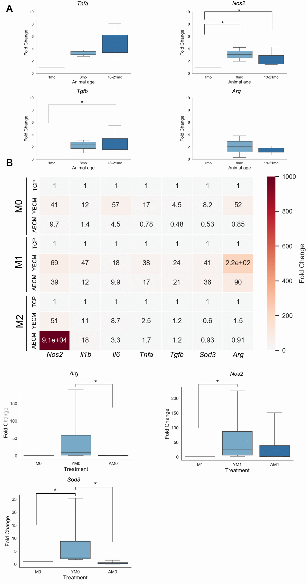 The present study also identified cardiac extracellular matrix age as a predictor of naïve macrophage phenotype and function. Aged cardiac extracellular matrix was observed to decrease both pro- and anti-inflammatory function, albeit to differing extents, with a mean reduction of 12% and 9.7% in the concentrations of nitric oxide and urea, respectively. The reduced M1/M2 functionality following aged cECM treatment was also supported by the gene expression trends quantified by qRT-PCR. Significant increases in relative expression of anti-inflammatory genes Arg and Sod3 were observed following culture with cECM derived from young (2-4 month) mice in the M0 condition, suggesting that without exogenous polarization cues cECM derived from young animals promoted alternatively activated macrophage gene expression. Additionally, a significant increase in Nos2 expression was observed in macrophages when cultured with cECM derived from young mice in the presence of Th1 cytokines. Taken together these results suggest that young cardiac extracellular matrix promotes alternative activation in the absence of cytokines but also supports macrophage polarization and activation when cultured in the presence of Th1 or Th2 cytokines. Conversely, macrophage culture with cECM derived from aged mice attenuated the increased expression of anti-inflammatory gene expression in the M0 control culture, attenuated pro-inflammatory gene upregulation in response to Th1 cytokines, and induced non-canonical upregulation of pro-inflammatory genes such as Nos2 or Il1b in the presence of alternative activation promoting cytokine IL-4. However, it is important to note that this trend was not observed for all pro-inflammatory gene targets assayed, such as in the case of Il6 or Tnfa. It is also important to note that the observed transcriptional alterations induced by decellularized cardiac extracellular matrix were only characterized at a high level using canonical M1 or M2-associated genes and future studies should seek to further expand upon the insight derived from this study by using a more comprehensive transcriptional landscape characterization tool such as RNA sequencing. Additional insight into the mechanism underlying these observed results may also be elucidated by epigenetic or other chromatin accessibility assays.