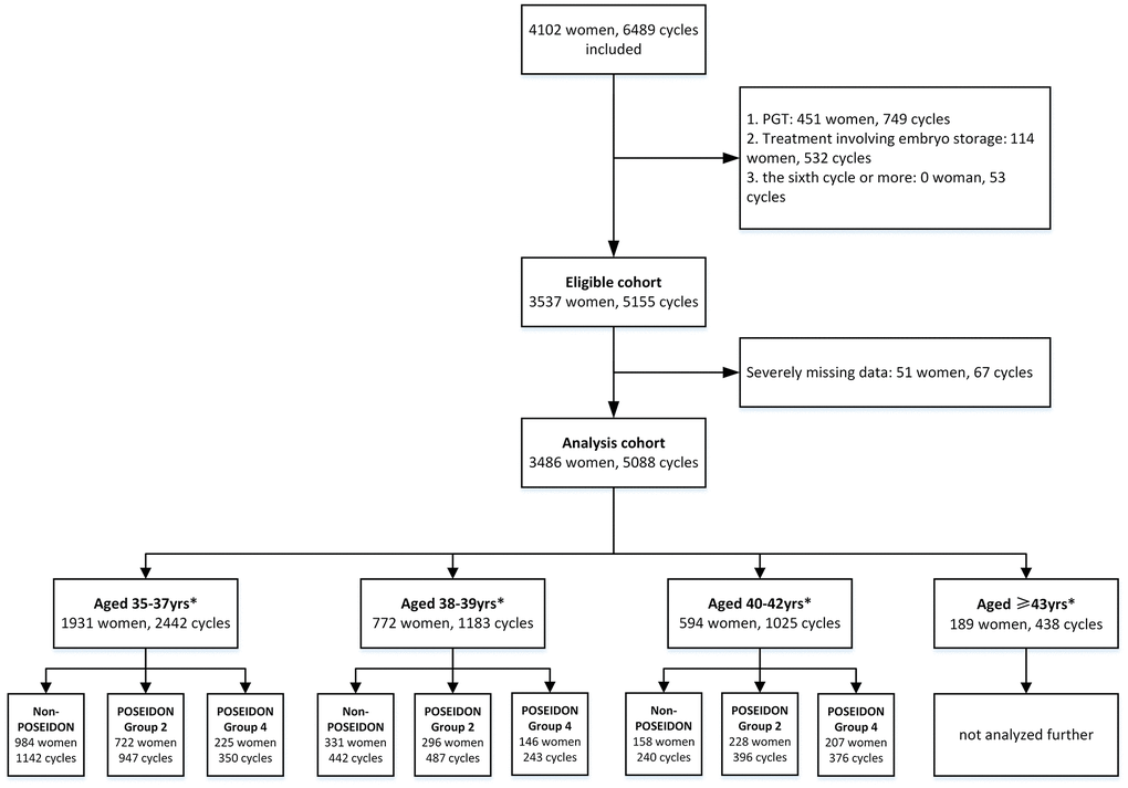 A total of 4102 Chinese AMA women, undergoing 6489 IVF cycles were included in this analysis. Of these, 616 patients were excluded for the following reasons: preimplantation genetic testing (PGT) cycles, embryo storage, missing data, etc. Finally, the study population consisted of 3,486 Chinese AMA women undergoing a total of 5088 IVF/ICSI cycles, including 1931 women aged 35-37 years, 772 women aged 38-39 years, 594 women aged 40-42 years and 189 women aged ≥43 years. Patients in each age strata were subsequently categorized into the following subgroups: POSEIDON group 2, POSEIDON group 4, and non-POSEIDON group. A flow chart with details of the cohort analyzed is presented in Figure 1.