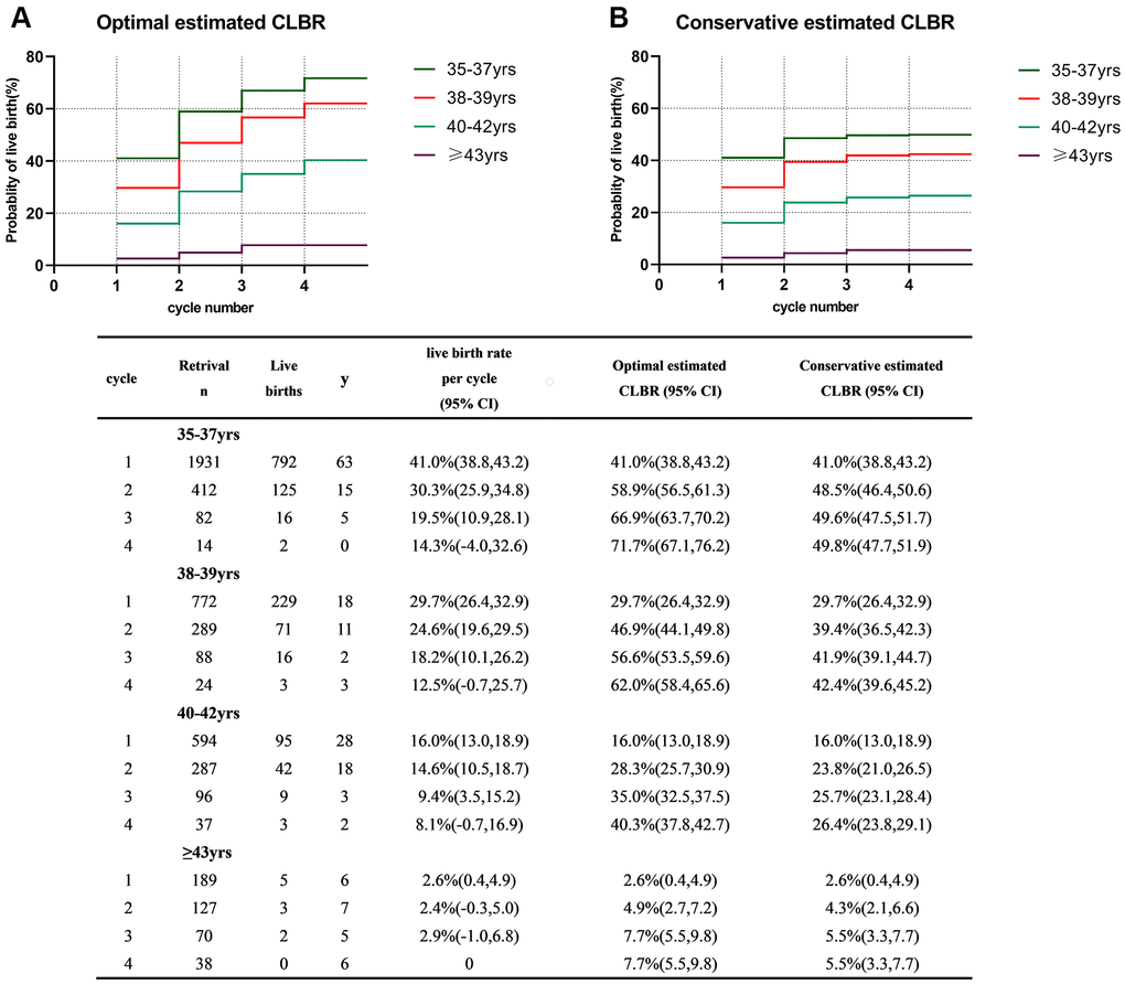 Figure 2 shows the optimal and conservative estimated CLBRs for each age-group. Both the optimal and conservative CLBRs significantly decreased with increasing age (P<0.001). Women in the group of 35-37 years had the best prognosis, with a CLBR of 41% after the first cycle and the optimal and conservative estimated CLBRs continuing to increase up to the 4th cycle to 71.1% and 49.8%, respectively. For women in the group of 38-39 years, although the CLBR declined significantly in the first cycle compared with that of the group of 35-37 years, they benefitted from repeat stimulation cycles. Their probability of success could reach acceptable figures between 62.0% and 42.4%. However, the LBR in the group of 40-42 years sharply declined to only 16.0% in the first stimulation cycle and the maximal likelihood of live birth was 40.3% after four stimulation cycles. For women older than 43 years old, the LBR per cycle was extremely low as optimal and conservative estimated CLBRs after the 4th cycle was only 7.7% and 5.5% respectively.