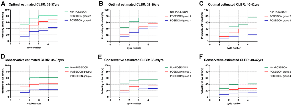Estimated CLBRs with different ovarian reserve for a given age group are graphically depicted in Figure 3. As shown in Figure 3, in all age groups, the LBR of the first cycle as well as the CLBRs over multiple cycles in the non-POSEIDON group were significantly higher than in POSEIDON group 2 (unexpected poor/suboptimal responder), followed by POSEIDON group 4 (expected poor responder) (P<0.001). However, women aged 35-37 yrs. and 38-39 yrs. of POSEIDON group 2 had a four-cycle CLBR of ~70% and ~57.3% optimally, which came close to those non-POSEIDON patients having CLBRs of ~81% and ~74.5% (Supplementary Tables 2–4). In contrast, patients aged 40-42 yrs. had a four-cycle CLBR of ~39.5%, which was 50% lower than the non-POSEIDON group.