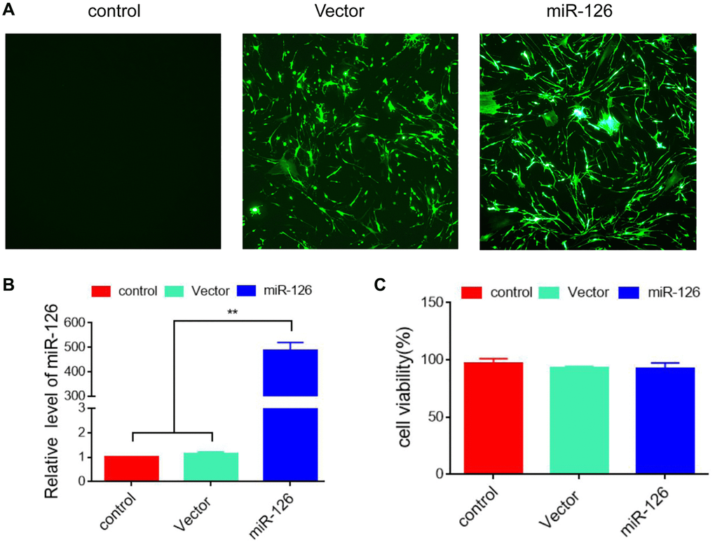 MDSCs were transfected with lentivirus expressing miR-126/GFP, and transfection efficiency was identified by immunofluorescence staining (Figure 1A). Then, qRT-PCR analysis was performed and found that the level of miR-126 were elevated remarkably, indicating the successful establishment of miR-126 overexpression in MDSCs (Figure 1B). We detected whether miR-126 affected cell activity by CCK-8 assay, and found that the viability of MDSCs was not reduced by miR-126 transfection (Figure 1C).