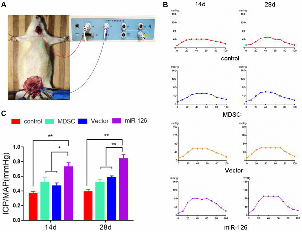 Next, miR-126-overexpressing MDSCs were injected into rats for 14 days. The erectile function was observed by detecting the values of ICP/MAP, operations of which were shown in Figure 2A. The results of Figure 2B, 2C depicted that after injection for 14 days, the ICP/MAP values in the miR-126 group (0.75 ± 0.15) were notably higher than those in the Control group (0.37 ± 0.07), as well as MDSC and Vector groups (0.54 ± 0.16, 0.49 ± 0.12, respectively). After injection for 28 days, compared with the ICP/ MAP values in the Control (0.38 ± 0.07), MDSC (0.54 ± 0.11) and Vector groups (0.60 ± 0.02), the ICP/ MAP values in the miR-126 group (0.84 ± 0.14) increased significantly.