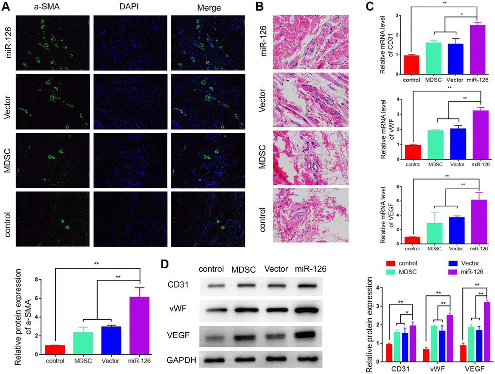 In order to further test the ability of miR-126 in enhancing revascularization, we observed the effect on increasing smooth muscle content by detecting the expression of α-SMA. The results in Figure 3A showed that rats injected with miR-126-overexpressing MDSCs had a higher α-SMA levels than rats in other three groups. At the same time, we also performed HE staining for the histological examination. The vascular structure was clearly more abundant in the miR-126 group than that in the other implanted groups (Figure 3B). Then we measured the expressions of CD31, von Willebrand Factor (vWF) and vascular endothelial factors (VEGF). The results in Figure 3C and 3D showed that the mRNA and protein expression of CD31, vWF and VEGF in the miR-126 group were remarkably higher than those of other three groups, indicating improved vascular function. In addition, TUNNEL staining was used for the detection of the degree of tissue necrosis, and showed that miR-126 significantly improved tissue necrosis (Supplementary Figure 1). All above findings demonstrated that the injection of miR-126-mediated MDSCs improved revascularization through increasing the content of SMCs and improving vascular function.