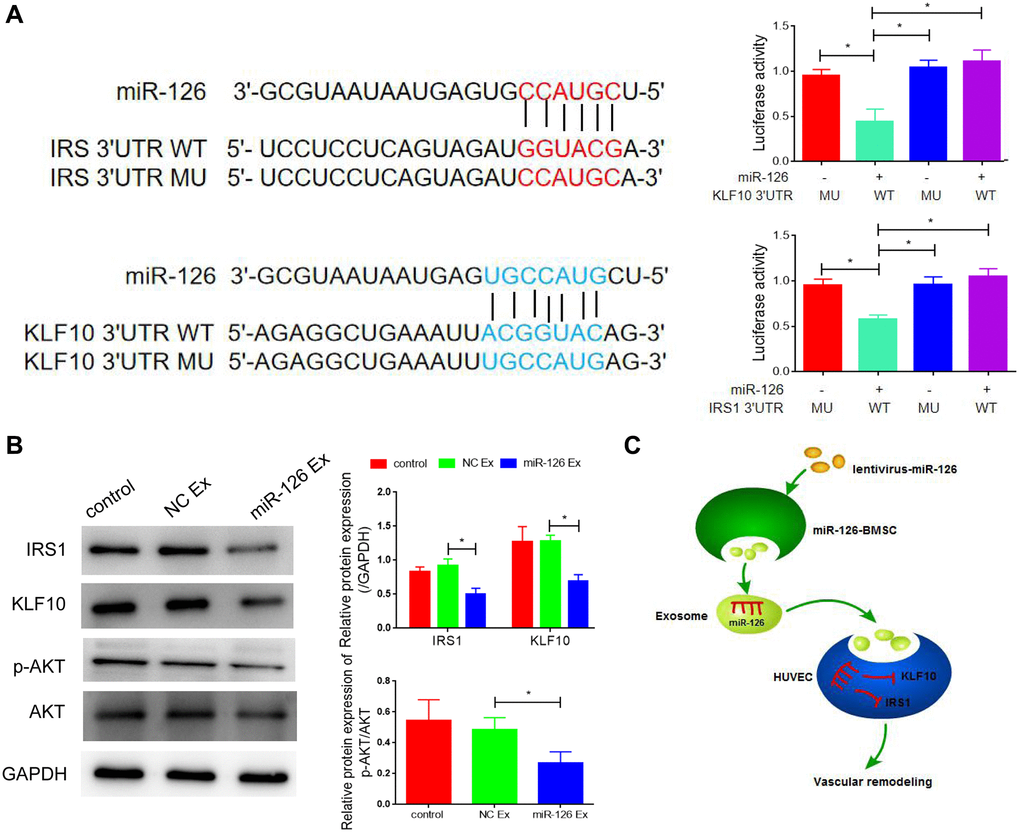 miRNAs take their actions through the binding to downstream target genes. After the utilization of Targetscan and miRDB databases, IRS1 and KLF10 were predicted as the potential targets of miR-126, which was shown in Figure 5A. To identify the direct interaction between IRS1, KLF10 and miR-126, we performed the luciferase reporter assay. The results indicated that MDSCs transfected with miR-126 reduced the luciferase activity of the wild type IRS1 3′UTR and KLF10 3′UTR but did not decrease the activity of mutant types (Figure 5A). To further confirm results above, qRT-PCR analysis and Western blotting were carried out to determine the expression of IRS1and KLF10 in miR-126-overexpressing MDSCs. In miR-126-overexpressing MDSCs, the protein expression of IRS1 and KLF10 was reduced significantly (about by 1.9-folds and 2.2-folds, respectively) (Figure 5B). After transfection of IRS1 and KLF10 respectively, we detected the angiogenesis, and found that the improvement of miR-126 on angiogenesis was inhibited after overexpression of these two genes (Supplementary Figure 3). Taken together, IRS1 and KLF10 were confirmed target genes of miR-126. Lastly, miR-126 engineered MDSCs notably repaired cavernosa injury in rats via vascular reconstruction by exosomes (Figure 5C).