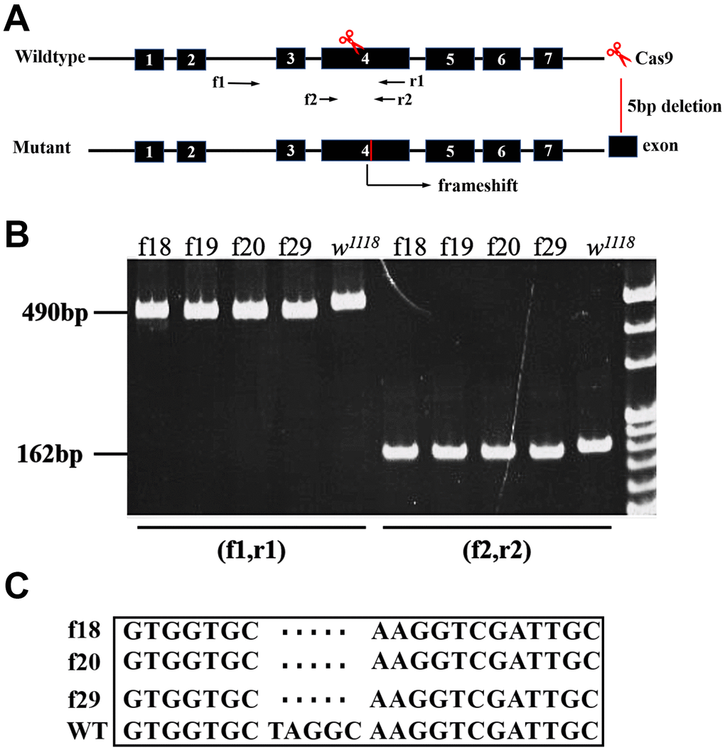 By CRISPR/Cas9 system, we selected two target DNA binding site on the third exon according to the rules [49]. We followed the target sequence design principle: 5’GG-N17–19-NGG3’. The sequences of two gRNAs utilized in this study are 5’-GGATACTTGTTTATGTGGAAACGG-3’ and 5’- GGAAAAGTGGTGCTAGGCAAGG-3’. After transcribed in vitro as previously described [50], the mRNAs and gRNAs were mixed to a final concentration of 800 ng/μl for the mRNA, 862 ng/μl and 613 ng/μl for the gRNAs, respectively. The mixture was centrifuged at maximum speed for 10 min before microinjection to w1118 embyos. Inheritable F0 which yielded enough F1 were collected for screen by using single fly PCR with the pair of primers: 5’-TGCAGCGTCTAATGAATTGG-3’ and 5’-GTCCCTACGATCGAAGTAGC-3’. Positive PCR fragment from homozygous flies were used for sequencing.