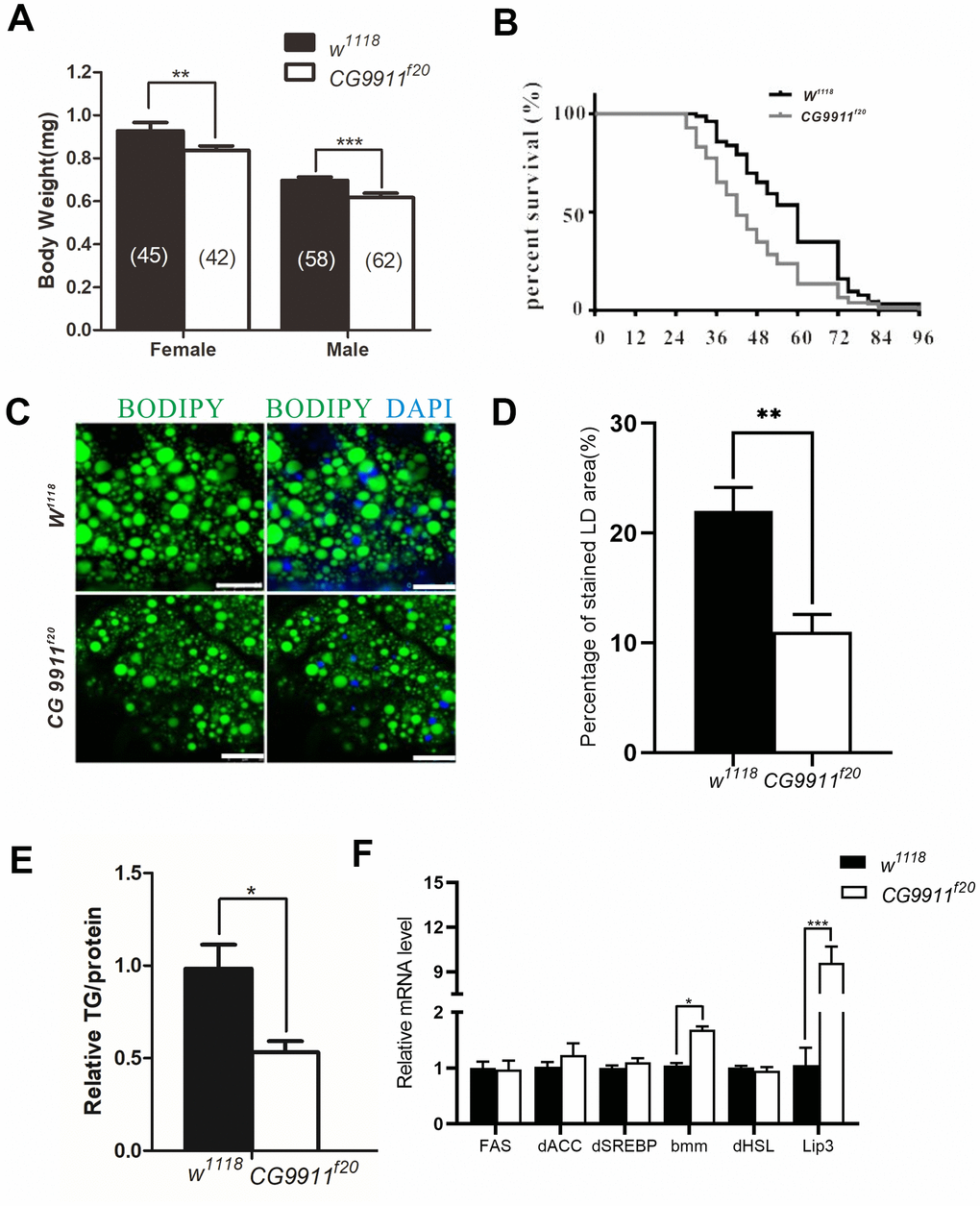 By using the CRISPR/Cas9 system, we generated CG9911 mutants whose phenotypes include: 1) CG9911 mutant flies exhibit lower bodyweight and more sensitivity to starvation; 2) both the size and number of lipid droplets are decreased and the mutant animals exhibit lower TAG level than the wild type; 3) The mRNA level of lipolysis related genes, bmm and Lip3, is elevated in adult flies. Some of the phenotypes except for the body weight are observed only in the fat body of adult flies. Apart from the fat body, oenocytes are the tissue where lipolysis occurs as well. However, our data indicated that CG9911 played roles only in the adult fat body.
