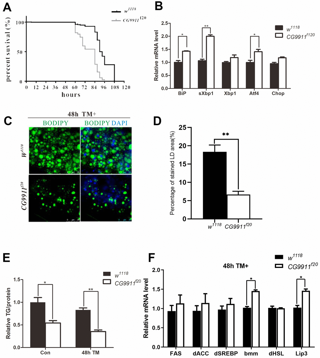 The bodyweight of both male and female adult flies ofCG9911f20 is significantly reduced compared to that of the wild type flies (Figure 2A), but the viability of the mutants remains unchanged (data not shown). However, the CG9911 mutants exhibit significantly lower survival rate than the wild type flies under starvation conditions (Figure 2B). Given that starvation affects cellular processes such as amino acid biosynthesis, protein and lipid metabolism, glucose metabolism and lifespan determination [24], we hypothesized that CG9911 may play a role in cellular metabolism. To test this hypothesis, we performed assays to assess lipid droplets (LDs) in the fat body (Drosophila fat tissue) at different developmental stages. At the larval stage, no significant differences of LD size or TAG levels were detected between the CG9911 mutant and w1118 wild type animals (Supplementary Figure 2A). Consistently, no difference on ectopic accumulation of fat was observed in Drosophila larval oenocytes (hepatocyte-like cells) under fed condition. CG9911 mutant did not alter the lipid mobilization compared with wild type under starvation (Supplementary Figure 3D). Though the LD size of CG9911 mutant was larger than w1118 at selfsame development stage (Supplementary Figure 3A), TAG detection showed no difference between mutant and wild type (Supplementary Figure 3B, 3C). Interestingly, BODIPY staining shows that the abdominal LDs of the 5-day old adult flies of CG9911f20 are fewer and smaller than that of the wild type flies (Figure 2C, 2D). More strikingly, the TAG level in the whole body of CG9911f20 is decreased by 46.6 % compared with that in the wild type control (Figure 2E). To verify the possible reasons for the fat decrease in the absence of CG9911, the expression of lipogenesis related genes (FAS, dACC, dSREBP) and lipolysis related genes (bmm, dHSL, Lip3) of whole body were examined by real time PCR (Figure 2F). Fatty acid synthase (FAS) and acetyl-CoA carboxylase (ACC) are two enzymes critical for energy production and storage in both Drosophila and mammals [25]. Drosophila sterol regulatory element-binding proteins (dSREBP) are transcription factors which regulate the synthesis of enzymes involved in sterol biosynthesis [26]. As shown in Figure 2E, expression of these lipogenesis related genes is not affected by the CG9911 mutation. However, as the key enzymes catalyzing the hydrolysis [27], lipase3 (Lip3) and adipose triglyceride lipase (bmm) show increased expression by different folds. The expression of bmm in CG9911f20 is ~1.6 folds of that in wild type animals, and Lip3 is ~9 folds. These results indicate that CG9911 loss of function results in an increase of lipolysis in the fat body of adult flies. Lipolysis is a process in which triacylglycerol is hydrolyzed into glycerol and free fatty acids (FFAs) in adipocytes and affects energy homeostasis [28]. Lipolysis can be stimulated by various factors including catecholamines, thyronines, glucocorticoids [29], TNF-α and lipopolysaccharides [30]. Lipolysis can also be increased by ER stress which is observed in the adipose tissue of burned patients and cultured human adipocytes [31]. Thus, we hypothesize that CG9911, an ER resident protein, affects lipolysis in response to ER stress.