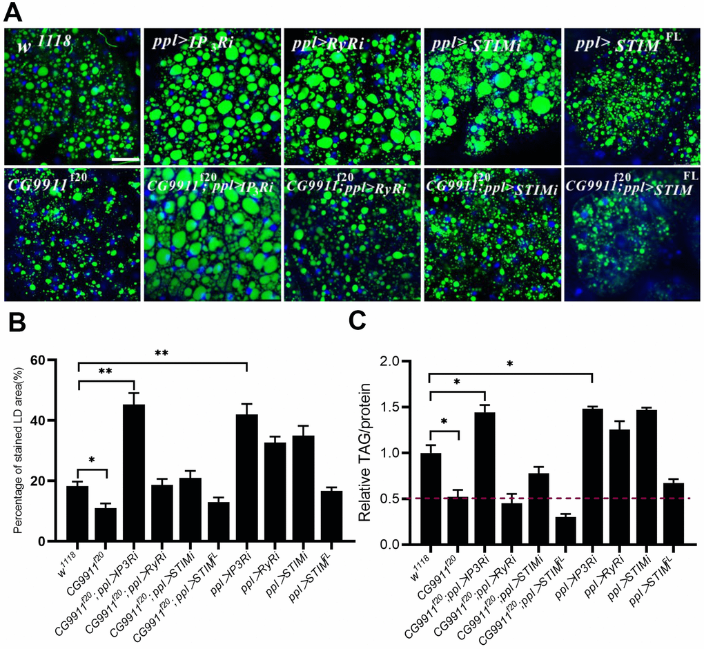 It has been reported that disruption Ca2+ signaling leads to activation of ER stress coping response, such as UPR and mobilization of pathways to regain ER homeostasis [37, 38]. Thus we wondered whether the elevated ER stress in CG9911 mutants is caused by Ca2+ flow from the ER to the cytoplasm [39]. We specifically knocked down or overexpressed IP3R, RyR and STIM in the fat body of CG9911 mutants. IP3R and RyR are two main types of Ca2+ channels that regulate Ca2+ release from ER to the cytoplasm [20]. STIM is also a regulator of ER Ca2+ store through store operated Ca2+ entry (SOCE) [40]. IP3R depletion leads to a phenotype of obesity and increased fat storage [21]. Our results show that knockdown of IP3R in fat body promotes both the size of LDs (Figure 4A, 4B) and TAG level (Figure 4B). IP3R knockdown efficiently rescues the decrease of lipid droplets and glyceride level caused by CG9911 deletion. IP3R, RyR and STIM knockdown lead to the increase of lipid droplets size (Figure 4A, 4B) and elevated glyceride content (Figure 4C). STIM knockdown partially alleviate the lipolysis phenotype of CG9911 mutants (Figure 4B, 4C). Interestingly, we specially investigated the mRNA level of UPR-related genes, and results indicated that IP3R knockdown could reduce the UPR caused by CG9911 deletion, which is proved by the significant decrease of Bip, sXbp1, Xbp1, and Atf4 (Supplementary Figure 4). These results indicate that blocking Ca2+ release from ER to cytoplasm by knockdown of IP3R significantly suppresses the phenotype of lipolysis in CG9911 mutant, implying that ER Ca2+ signal has contributions to the lipolysis phenotype caused by depletion of CG9911.