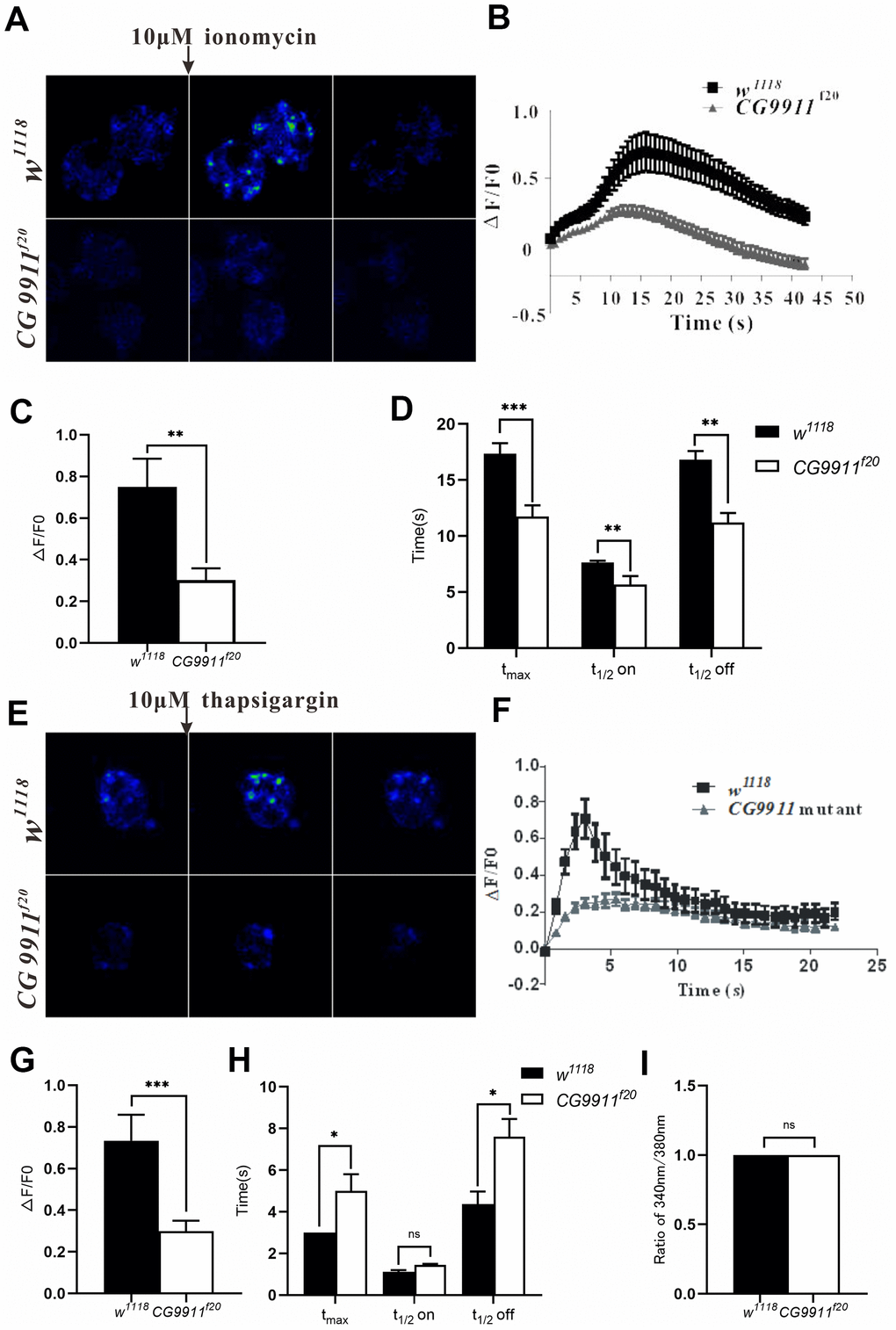 Given the fact that the increased lipolysis phenotype of CG9911 mutant is suppressed by the down-regulation of Ca2+ channel, we reasoned that CG9911 may play a role in ER Ca2+ homeostasis. To test this hypothesis, Ca2+ imaging experiments were performed with the fat body of CG9911 mutant and the wild type files. Cells with Fluo-4 AM, Ca2+ indicator, were treated with 10 μM ionomycin (an ionophore that binds Ca2+) to stimulate Ca2+ release from ER to cytosol (Figure 5A). The fluorescence signals were recorded to calculate the ER calcium level (Figure 5B). Compared to the wild type, the amplitude of ionomycin induced Ca2+ transients in CG9911 mutants is decreased by 57% (Figure 5C). Dynamically, Ca2+ release in CG9911 mutant fat body is different from that in wild type animals: the time of fluorescence signal from the basal level to the peak (tmax), the half time of rise (t1/2on) and half time of decay (t1/2 off) are shortened by 32.6%, 29.1% and 37.1%, respectively (Figure 5D). In accordance with the results by ionomycin treatment, Ca2+ release induced by 10 μM thapsigargin (TG, the non-competitive inhibitor of SERCA) is reduced by 58.4% (Figure 5E, 5G) with tmax and t1/2 off increased by 68.7% and 83.7% (Figure 5H). Previous study revealed that ERp44 affects Ca2+ homeostasis by regulating the activity of IP3R1 in mammalian cells [41]. To check whether CG9911 affects cytosol Ca2+ level, we performed the experiments of the relative resting Ca2+infat body of CG9911f20 flies and the wild type flies. Individual fat body cells of adult flies were incubated with Fura-2 AM. Our results show that the resting Ca2+ level presented by the fluorescence ratio of 340 nm/380 nm is not significantly different between CG9911 mutant and the wild type (Figure 5I). Together, these results indicate that CG9911 plays a role in maintaining ER Ca2+ homeostasis in Drosophila fat body. The resting Ca2+ signaling is unlikely contributes to the increased lipolysis phenotype of CG9911 mutant flies.