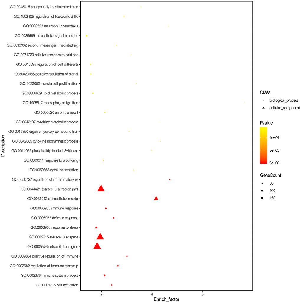GO (Gene Ontology, http://www.geneontology.org/) database was used to classify genes according to the biological processes, cellular components and molecular functions. The p value was corrected by Bonferroni, Holm, Sidak and FDR approach. When the corrected p-value (FDR) < 0.05, it is considered that there is a significant enrichment of this GO function.
