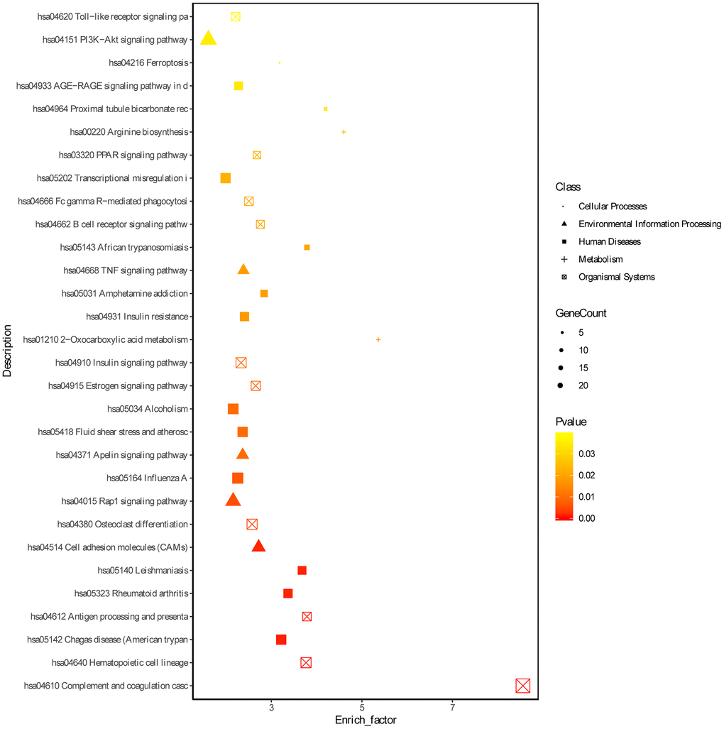 Based on the threshold of FDR < 0.05, we obtained 772 GO terms for the DEGs. The top significant GO terms were related with immune response, such as “immune system process” (gene count: 133; FDR = 0) and “regulation of immune system process” (gene count: 84; FDR = 0) and “immune response” (gene count: 94; FDR = 0) (Figure 2, Supplementary Table 3). Simultaneously, we obtained 15 significant KEGG pathways for the DEGs, including “Complement and coagulation cascades” (gene count = 21, FDR = 0), “Phagosome” (gene count = 15; FDR =0.0016), and hematopoietic cell lineage (gene count = 11; FDR = 0.0037) (Figure 3 and Supplementary Table 4).