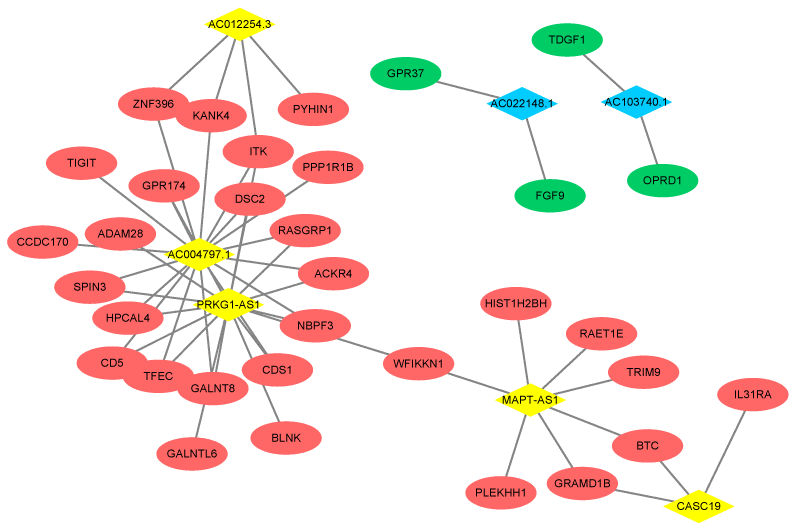Based on the Pearson correlation coefficient > 0.9, a co-expression network containing 7 DElncRNAs, 33 DEGs and 51 edges was built (Figure 4). Five upregulated lncRNAs, including AC004797.1 (degree = 17), PRKG1-AS1 (Protein kinase CGMP-dependent 1-antisense 1; degree = 16), MAPT-AS1 (microtubule associated protein tau –antisense 1; degree = 7), AC012254.3 (degree = 4) and CASC19 (degree = 3) and two downregulated lncRNAs, including AC022148.1 (degree = 2) and AC103740.1 (degree = 2) were included in this network. The DEGs of ITK (IL2 inducible T cell kinase) and DSC2 (desmocollin 2) could be positively regulated by the lncRNAs AC004797.1 and PRKG1-AS1.