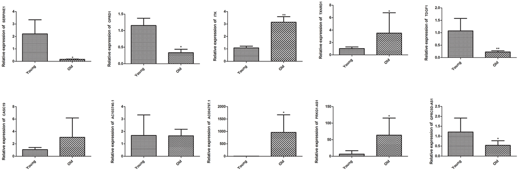 To further validate the reliability of RNA sequencing, we performed qRT-PCR on five DEGs, including SERPINE1 (Serpin family E member 1), OPRD1 (Opioid receptor delta 1), ITK, TXNRD1 (Thioredoxin reductase 1) and TDGF1 (Teratocarcinoma-derived growth factor 1), as well as five DElncRNAs, including CASC19, AC103740.1, AC004797.1, PRKG1-AS1 and GPRC5D (G protein-coupled receptor class c group 5 member D)-AS1. The RNA sequencing data showed that ITK, TXNRD1, CASC19, AC004797.1, and PRKG1-AS1 were upregulated, while SERPINE1, OPRD1, TDGF1, AC103740.1 and GPRC5D-AS1 were downregulated in the muscle of old group. As shown in Figure 5, the qRT-PCR results of ITK, TXNRD1, AC004797.1, PRKG1-AS1, SERPINE1, OPRD1, TDGF1, and GPRC5D-AS1 were in line with the RNA sequencing data, while no significant difference on CASC19 and AC103740.1 were detected between muscle of young and old group by qRT-PCR.