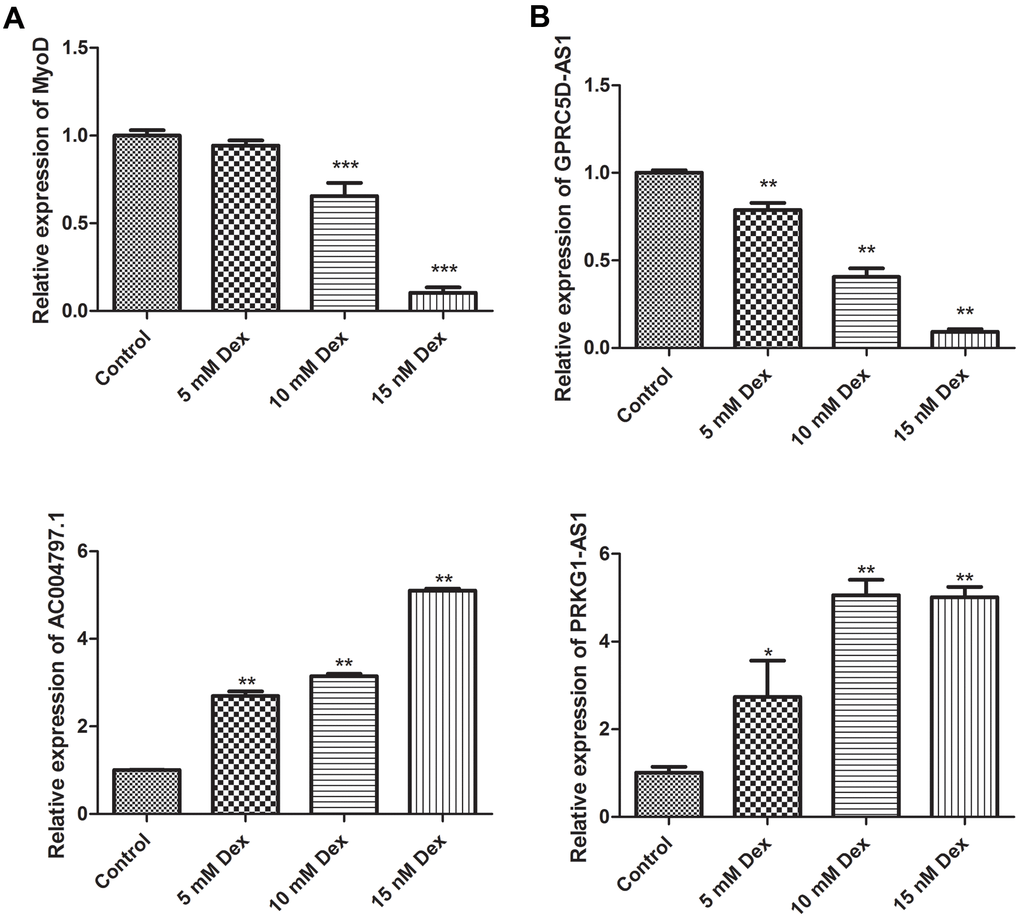 To further investigate the roles of critical DElncRNAs, we established a muscle atrophy cell model by dexamethasone. The expression of myoblast determination protein 1 (MyoD), a skeletal muscle-specific bHLH transcription factor, was gradually decreased in a dose-dependent manner. The expression of MyoD at 10 nM and 15 nM dexamethasone treatment groups was significantly different from that of control group (P < 0.001), indicating the muscle atrophy cell model was successfully established (Figure 6A). The expression levels of three DElncRNAs, including PRKG1-AS1, AC004797.1 and GPRC5D-AS1 were determined under dexamethasone treatment. As expect, the expression levels of PRKG1-AS1 and AC004797.1 was increased in a dose-dependent manner, while GPRC5D-AS1 was decreased in a dose-dependent manner (P < 0.05, Figure 6B).