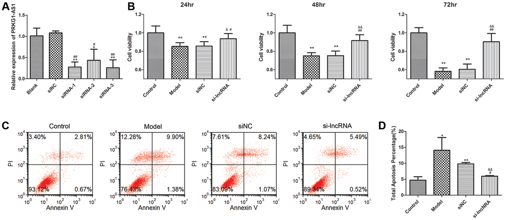 We selected PRKG1-AS1 for further research. The expression of PRKG1-AS1 was knocked down by siRNA. qRT-PCR suggested that the expression of PRKG1-AS1 in siRNA1, siRNA2 and siRNA3 was all decreased and the decrease of PRKG1-AS1 in siRNA3 group was the most significant (P < 0.01, Figure 7A). Therefore, we selected siRNA3 for further experiment. CCK-8 assay showed that knock-down of PRKG1-AS1 could significantly increase cell viability in a time-dependent manner (P < 0.05, Figure 7B). Besides, flow cytometry demonstrated that cell apoptosis was significantly decreased by knocking-down of PRKG1-AS1 compared with the model group (P < 0.01, Figure 7C, 7D).