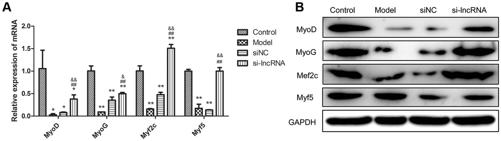 In order to validate the effect of PKG1-AS1 at molecular level, we detected the mRNA and protein expression of muscle regulatory factors, including MyoD, MyoG, Myf2c and Myf5. As shown in Figure 8, these four factors were significantly decreased in the dexamethasone-induced muscle atrophy cell model (P < 0.05). After transfection with si-PRKG1-AS1, their expression was significantly upregulated both at mRNA level (P < 0.05). Western blot analysis showed consistent results with qRT-PCR, except for myf5, which showed no significant difference among groups.