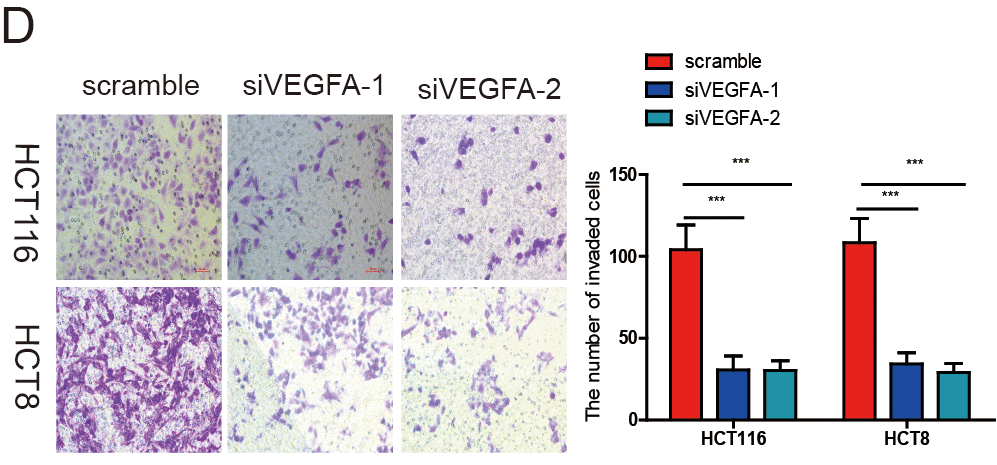 This article has been corrected: The authors replaced panel D of Figure 7, where the images of HCT116/siVEGFA-1 and HCT116/siVEGFA-2 were identical, because the image HCT116/siVEGFA-1 was accidentally used twice. The correct image of HCT116/siVEGFA-2 from the original set of experiments was used for new panel 7D, which is provided below.