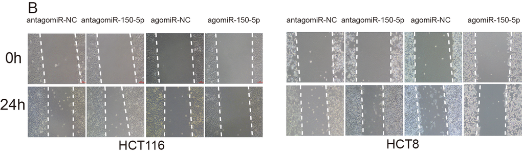 The authors replaced panel B of Supplementary Figure 1, where the images of HCT8/agomiR-NC (0 h) group and agomiR-150-5p+vector (24h) group were used instead of the images of HCT8/agomiR-150-5p group (0, 24h). The correct images of HCT8/agomiR-150-5p group (0, 24h) from the original set of experiments were used for new panel S1B. Additionally, authors added 0 and 24h marks to the panel S1B, which is provided below.